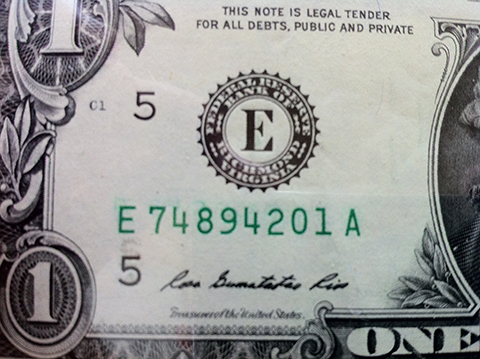 It's the first bill of a strap (serial ending in 01), so when the paper band was wrapped around the strap immediately after printing and cutting, it rubbed against that note while the ink was still slightly wet. Various smudges and ghosts of the overprint are pretty common on notes with serials ending in 01, and especially those ending in 001 (since the latter come into contact with the plastic shrinkwrap on the 1000-note bundle, as well as the paper band on the 100-note strap).