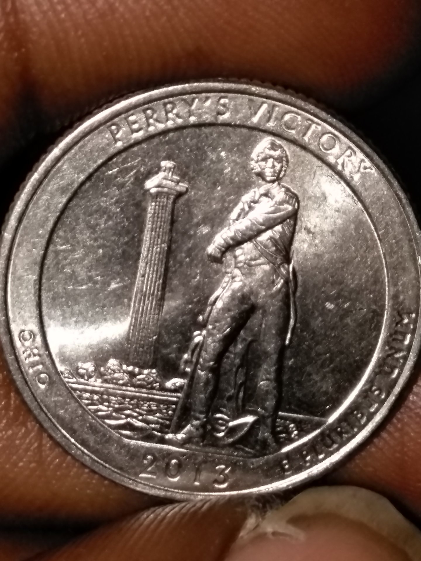 On the head of the quarter there is a lack of detail in the hair and not a strong impression of Washington's head. And notice a squigley line in his hair? Also, the lines going across the head. the words on the quarter are impressioned just fine. On the back, there seems to be a small gouge near the S in the word Perry's. Are any of these markings possible errors? Zoom in to get a better look.