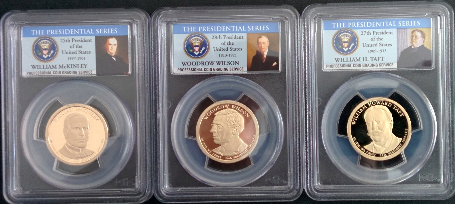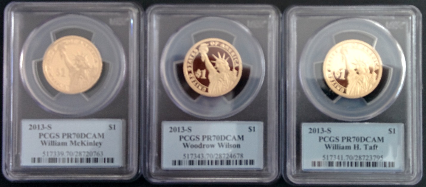 I have for sale 3 "perfect 70" PCGS graded Presidential Dollars from the 2013 series. These are proofs minted in San Francisco and look flawless. They have "The Presidential Series" labels. $40 each ($2 first class mail). $125 shipped if you buy all 3. Will entertain offers. Let me know if you have any questions. (sorry, no TR) Thanks Rob