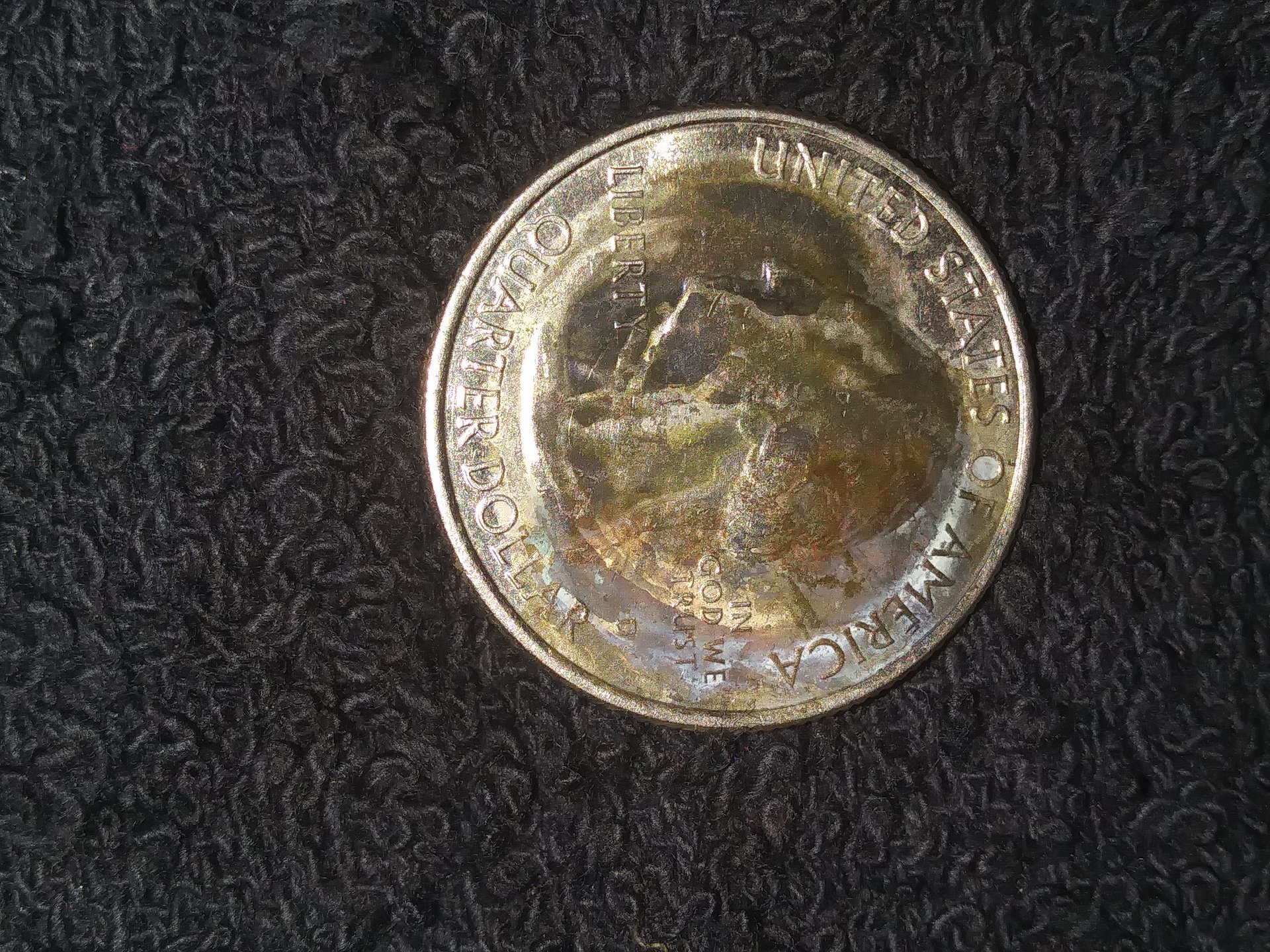 The obverse (front) suffered some type of environmental damage. There's a lot of nasty stuff out there and if it stays in contact with the metal surface for awhile, it can cause all kinds of color changes. Generally, these don't wipe off. As you continue to look, you'll find lots of discolored coins. Nearly all of them are due to environmental damage. There are a few specific error like missing clad layers and improper alloying that can occur, but these are rare and hard to find (Like the Lottery, someone wins, but it's not going to be me or you). Pay attention to the links that people post regarding errors and varieties. You can learn a lot from these