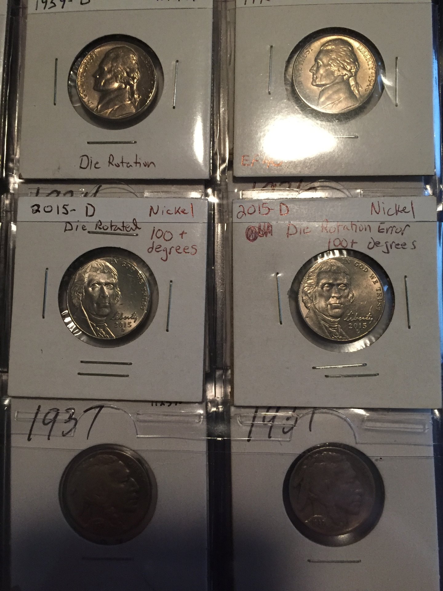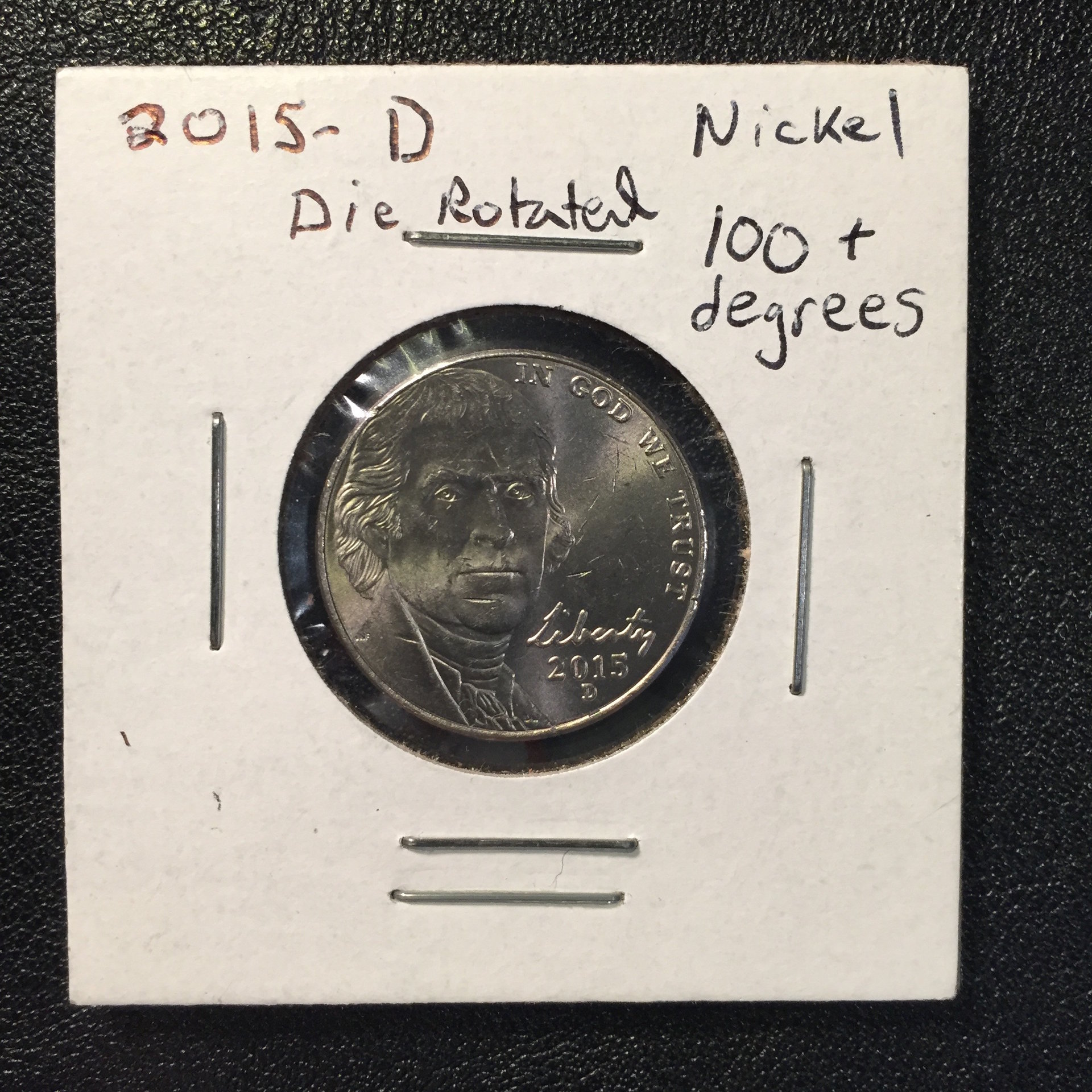 I found a 2015 D Jefferson Nickel with Monticello tilted 110 degrees...made my head spin when I flipped it over!! I've searched probably 500 nickel rolls in the past 3 months and this is the only one I've found. I've seen another one (on eBay) a few weeks ago...it sold for $146.00. Anyone else spot one of these?