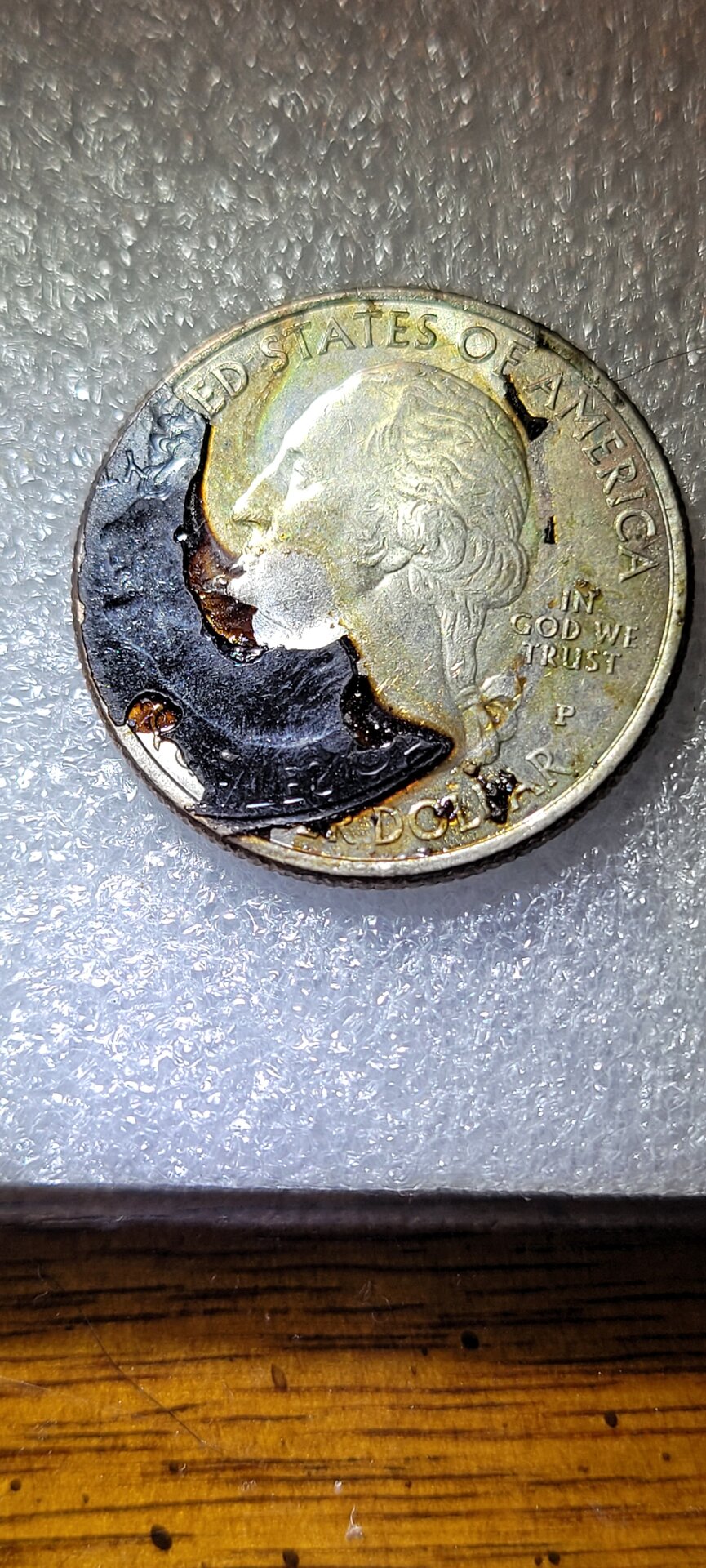 Looks like it sat at the bottom of a used spit cup (tobacco) until all the liquid evaporated, leaving just the hardened goo residue on the coin.
