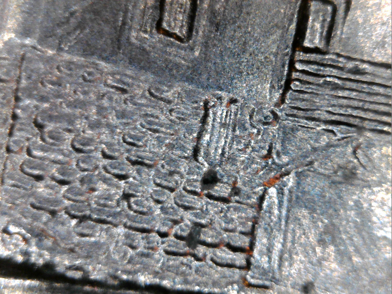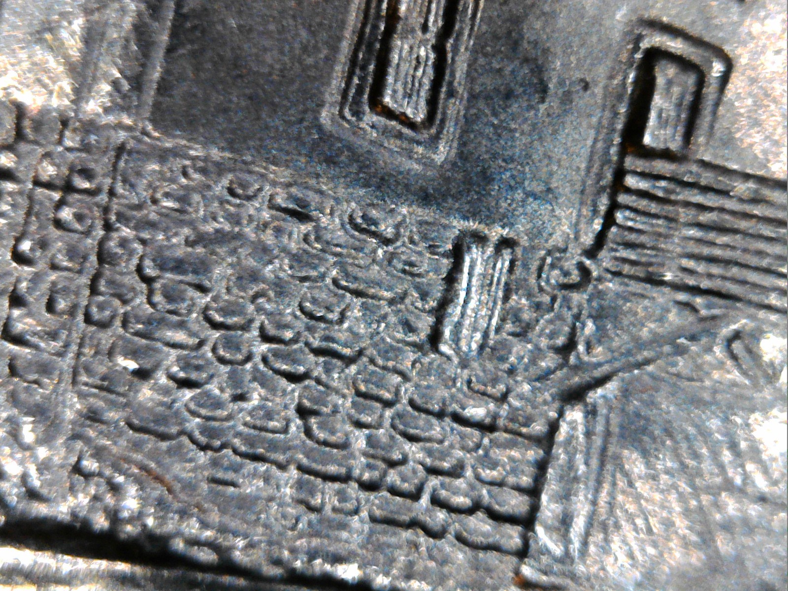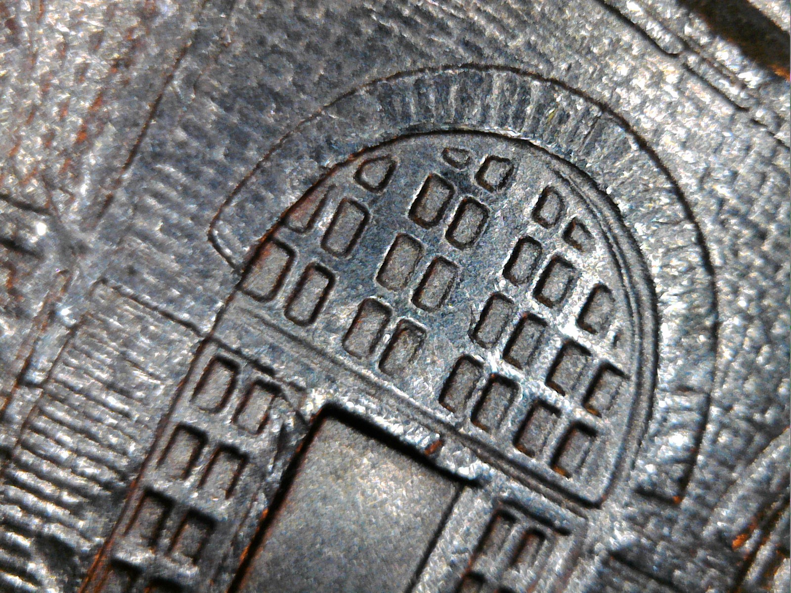 The only other OR quarters that I have to compare to are three that I sat aside to look at closer. Again, these are somewhat blurry due to wear on the coin. The doubling on these (if there is any) would be what would appear as an "extra rock" at the bottom of the cellar windows. I'll post the previous picture again so that they will all be side by side. Every 2 pictures is of one coin, these pics are of 4 coins total.