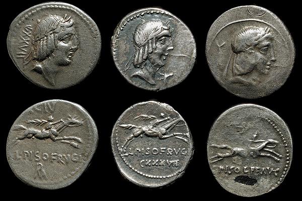 I have only one of this series and it is a plated ancient counterfeit or fourree (right below). The other two I show are a generation earlier when Gaius' father Lucius held the position of moneyer and issued a huge number of these coins. Many of his dies were numbered and used to failure. I have not done the research to see how many Lucius types there are but between father and son, this becomes a very common denarius. I have to note that the bee/B die matching shown above is not a play on the words since the Latin word for the insect is Apis not starting with a B. I was not aware that these were the highest relief coins. My fourree is not high relief and the two of the father are not remarkable in this way. It does bring up a point I find interesting about Republican coins. The production was controled by the moneyers who hired and disciplined the workers. Some cared more than others. Some employed die cutters of great skill while others got the cheapest money could buy. Some designs are well thought out and carefully produced. Others were rushed and often off center. There are some Republican coins that are embarrassingly bad and others that are beautiful within a very short time frame. The Calpurnia are not my favorites but are often good looking coins. Republicans are well studied with great books (like Crawford), several illustrated catalogs of big collections showing most of the types and now a great online resource. The British Museum has posted its massive collection online. The problem is that I find coins very hard to find although I suspect a bit of practice would help that. My link below says it returns over 300 coins that might be of interest but I fail to find them all. Does anyone have skills with this catalog that make it useful? http://www.britishmuseum.org/resear...rnius+Piso+Frugi/!//!!//!!!/&allCurrentPage=1
