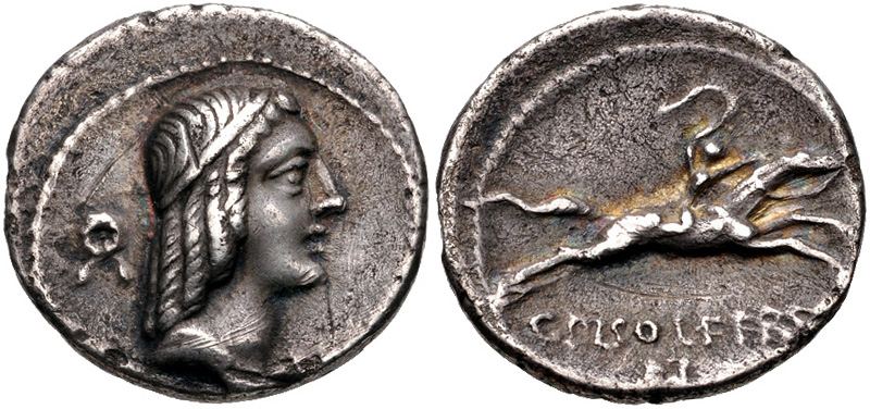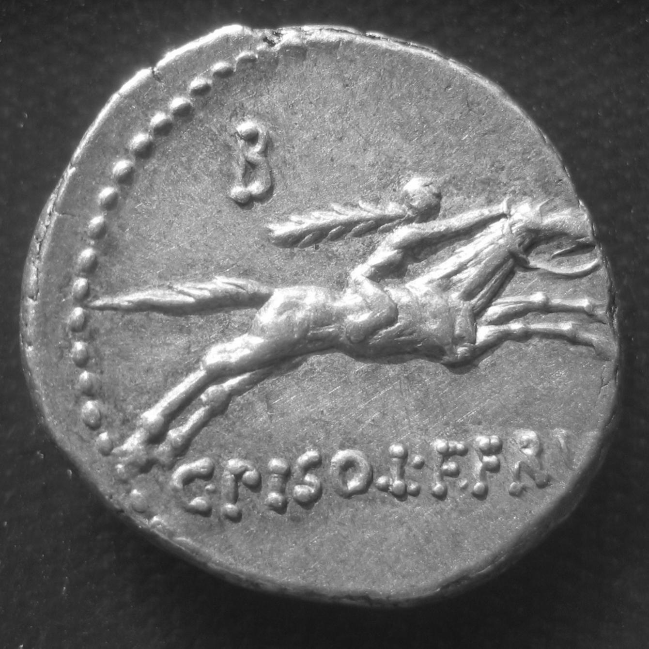 C. Piso L.f. Frugi AR Denarius 61 BC Rome mint Diameter: 17 mm Weight: 3.73 grams Obverse: Head of Apollo right, hair bound with fillet; wreath behind Reverse: Horseman galloping right, holding whip Reference: Crawford 408/1b (O40/R56); Hersh, Piso 238 (O235/R2056); Sydenham 866; Calpurnia 24d Other: 6h, VF, toned, porous surfaces, cleaning marks under tone