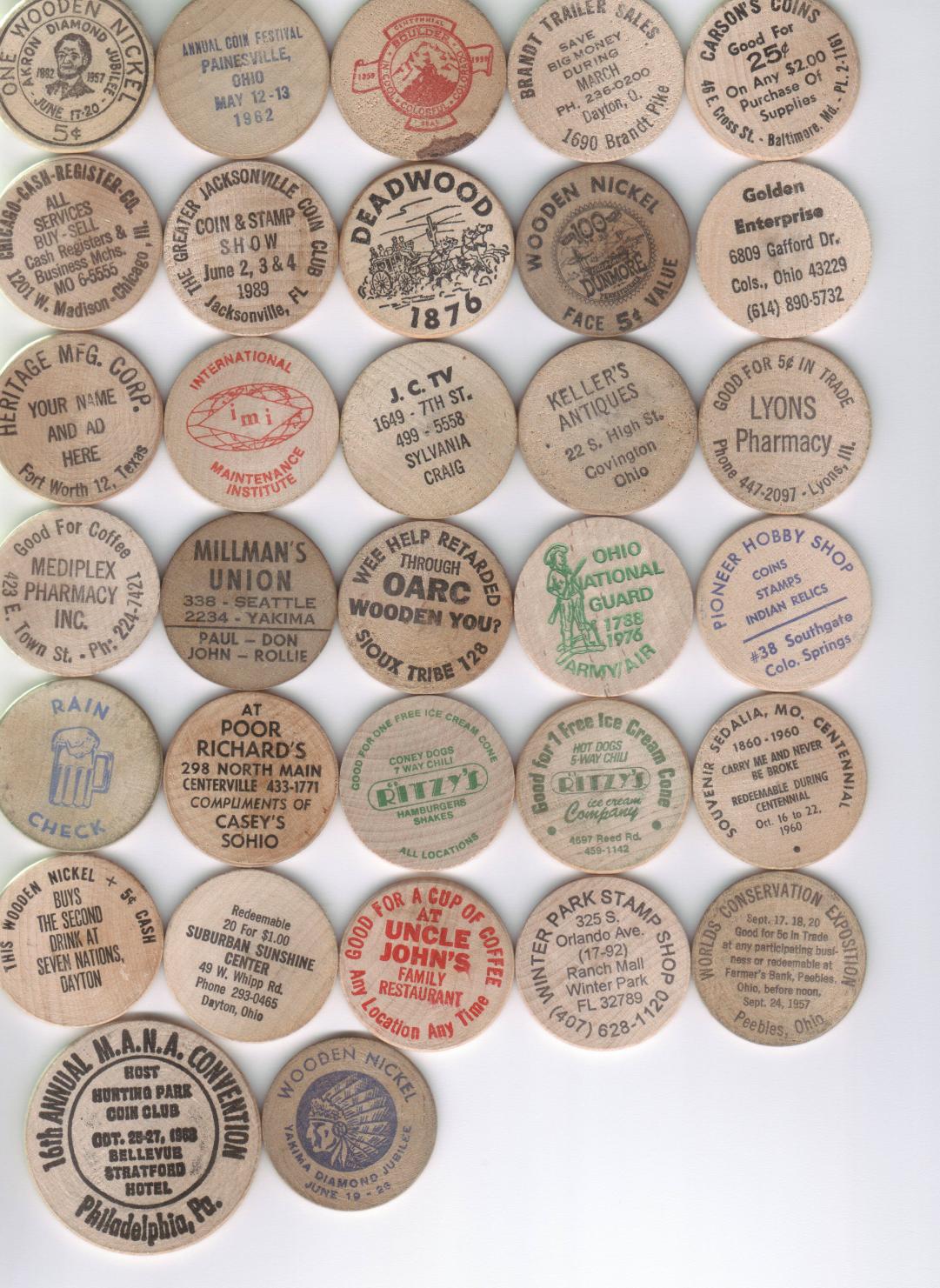 SOLD 32 Different Wooden Nickels, $20 postpaid