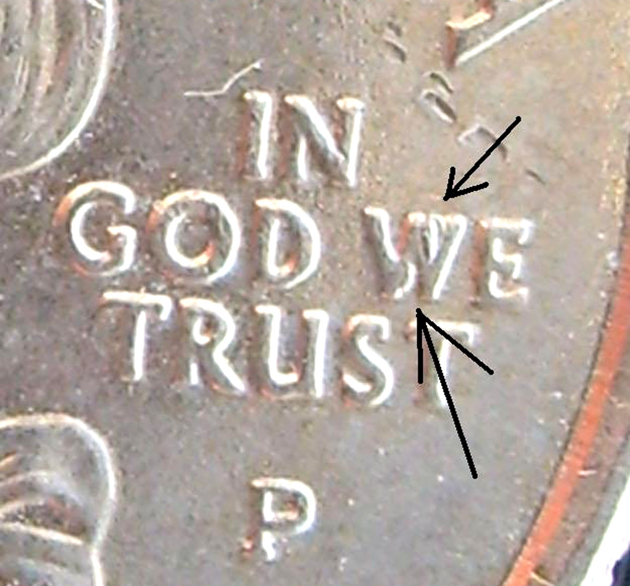 Are you sure that #4 is supposed to be a "^" and not simply the base of the shaft where the blade of the spear begins? The "9" and the "W" of IGWT appear to have die chips in them which are fairly common on letters and numerals. Chris