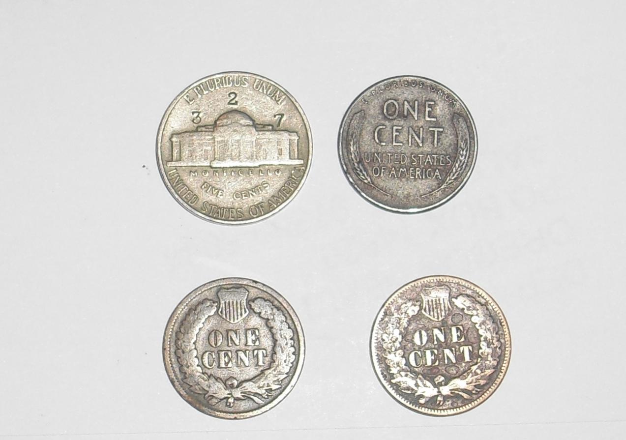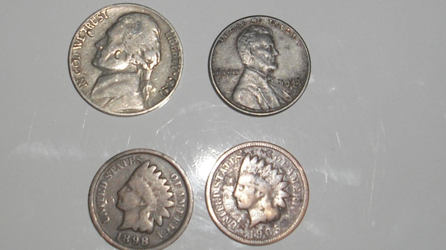 The nickel has damage, so no value. The two indian head cents not worth much, $1 each at most. What color is the 1943 cent? It appears copper. If it is copper, you need to take that coin to a dealer or expert on coins since it would be an extreme rarity. It should be zinc plated steel. If it is silver colored, its value would be around $1. Again, if the 43 appears copper colored, either someone tampered with it or its worth a LOT of money, like in the hundreds of thousands. Chris