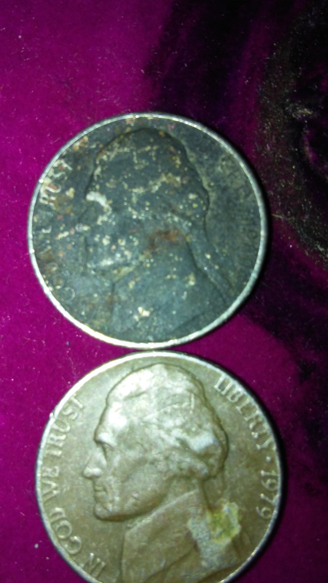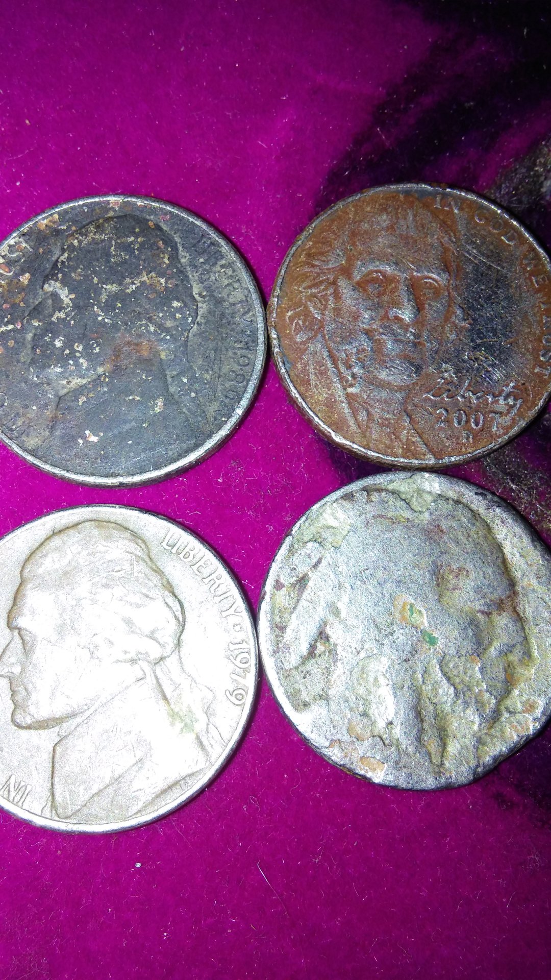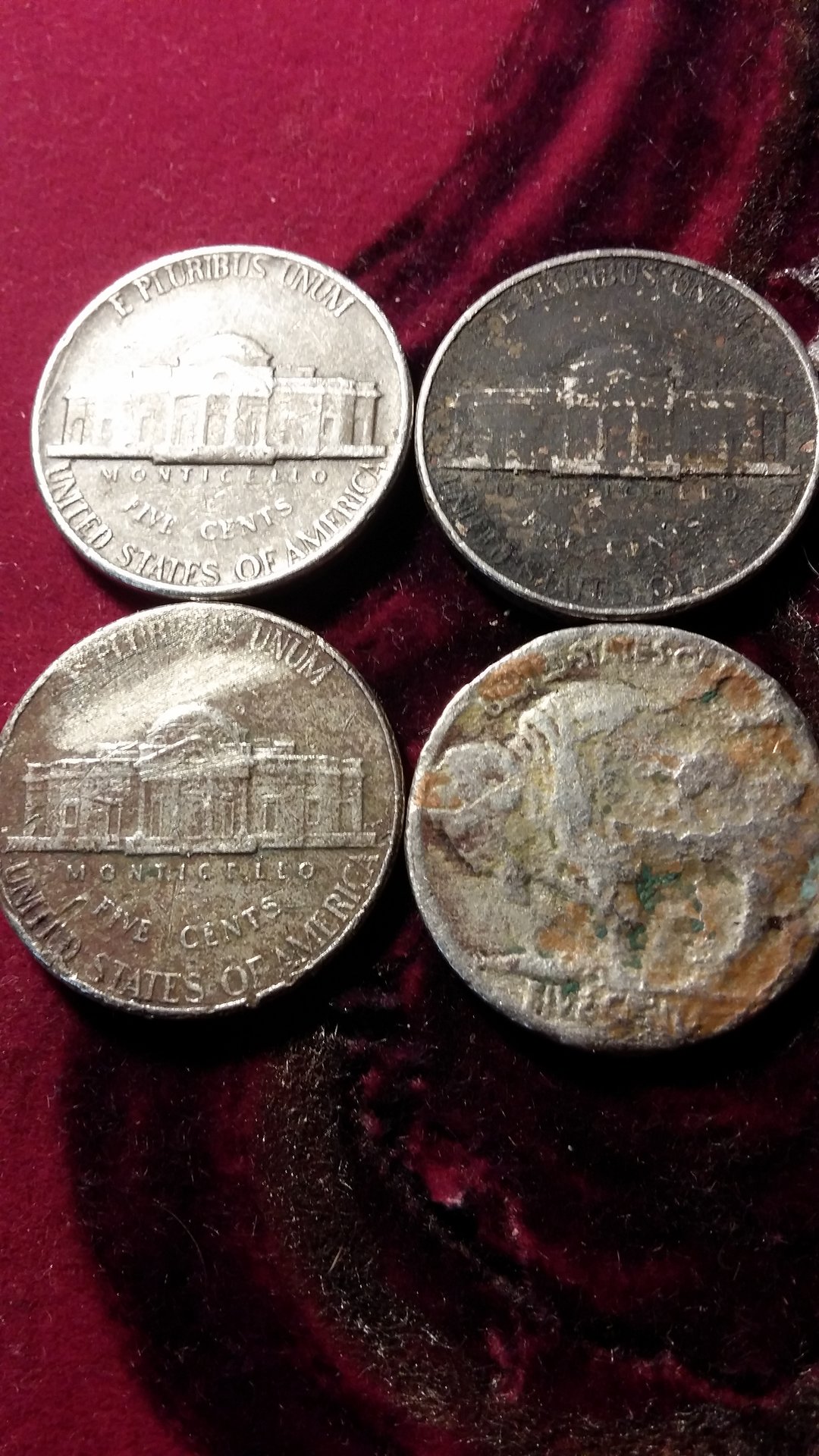 I would guess environmentsl damage on all four, but 3 all have resembled, in a different way , missing clad layer or struck on wrong planchet nickels. New to this coun stuff, glad this site is here.Sorry if pictures aren't great.