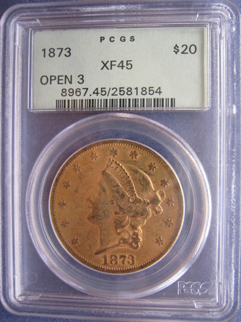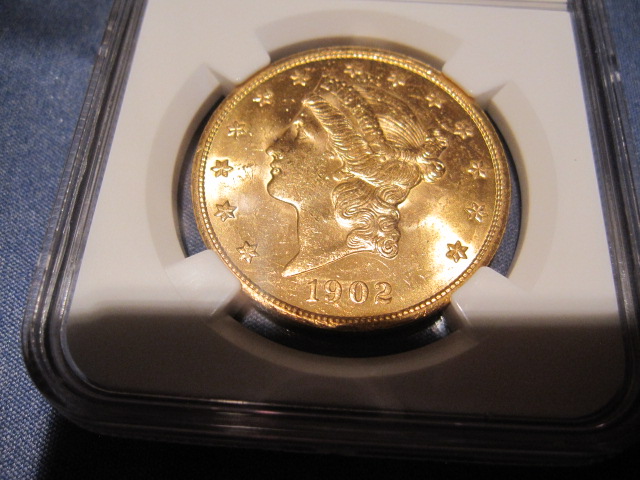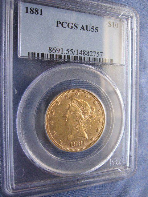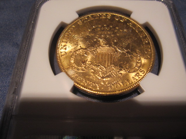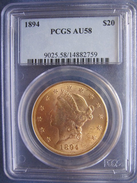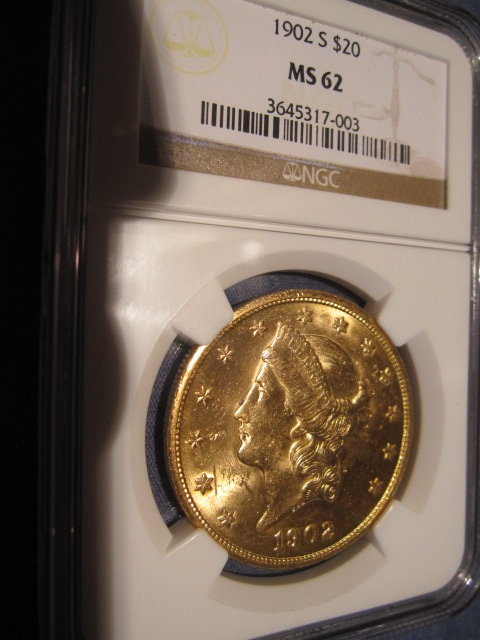 NGC MS62 1902-S $20 Lib. (better date) very nice obverse, reverse with a mark above the word "dollar"... $1460. (CDN MS63 is $2600) PCGS AU58 1894-P $20 Lib. A very beautiful AU58 coin.... $1350 PCGS AU55 1881-P $10 Lib.... $650 (almost melt) PCGS XF45 1873 TY-2 $20 Lib. in OGH....$1380 Prices include shipping.