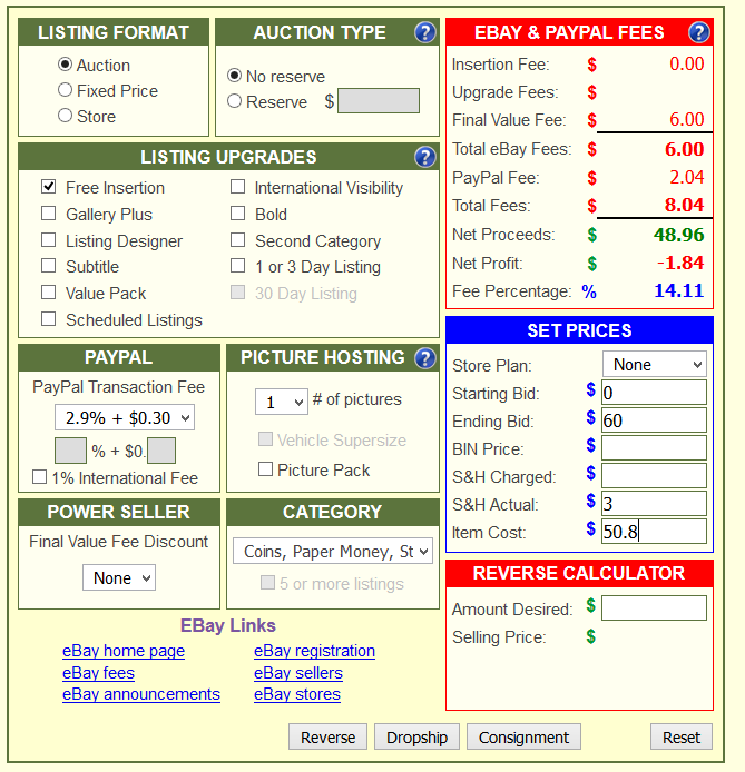 Assuming $60 with standard fee's and shipping costs of $3 those sellers are getting back of melt as shown below. Have you guys ever tried selling via the buy/sell forum here? Pretty sure you could easily get melt even for 40% as I know I have multiple times in the past.
