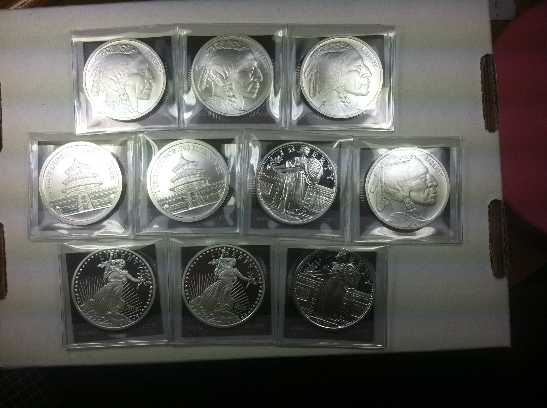 PayPal Gift or USPS Money Order $100+ Ships For Free $3 Shipping For Orders Less Than $100 PM if interested, prices are firm. 550+ Feedbacks on eBay and many sales here. 2013 Reverse Proofs (4) 2013 W $1 Reverse Proof American Eagle NGC Retro PF 69 ER = $75/ea. 5 oz (1) 5oz 2013 Fiji Taku Puck = $140 (1) 5oz Pan American Silver Corp = $125 (1) 5oz Apmex Puck = $125 1 oz (10) 1oz Golden State Mint Bars = $230 (10) 1oz Provident Rounds = $230 (5) 1oz Art Bars = $125 (3) 1oz 2013 Fiji Taku Coins = $84 (2) 1oz 2013 Canadian Wildlife Antelope = $52 (1) 1oz Pamp Suisse Bar = $30 (1) 1oz 2012 Britannia = $30 (1) 1oz 2012 Fiji Taku = $28 (1) 1oz 2013 Canadian Maple Leaf = $24 1/2 oz (1) 1/2oz 2013 Fiji Taku = $18