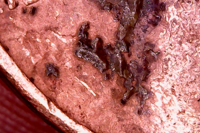 Looks like some heavy corrosion damage. Keep looking. Even the minor filled dies and die cracks are hard to find