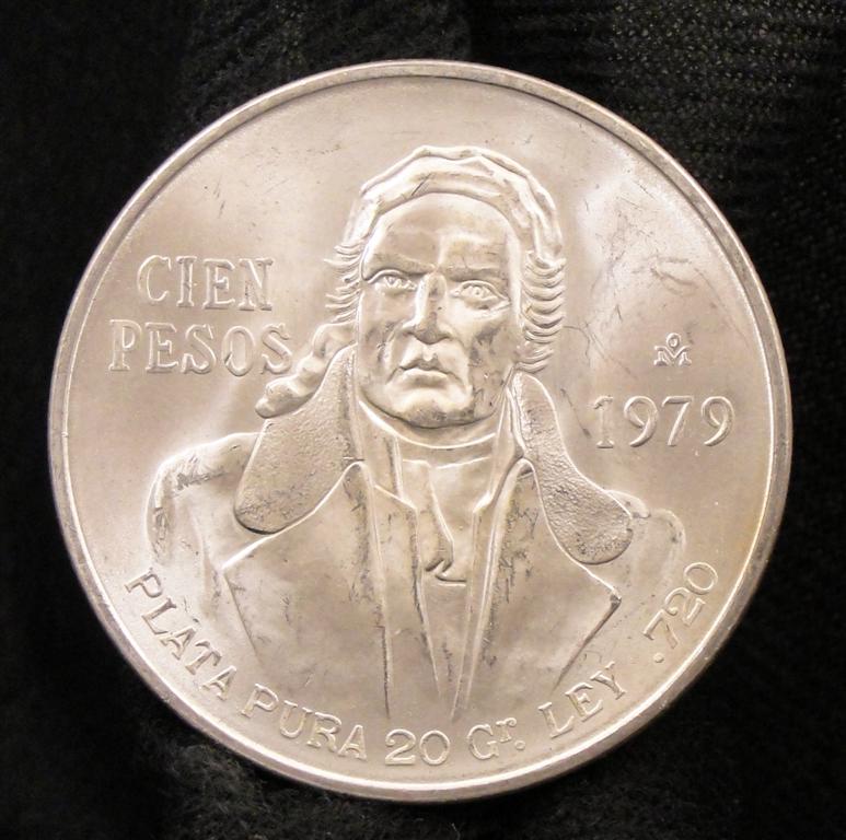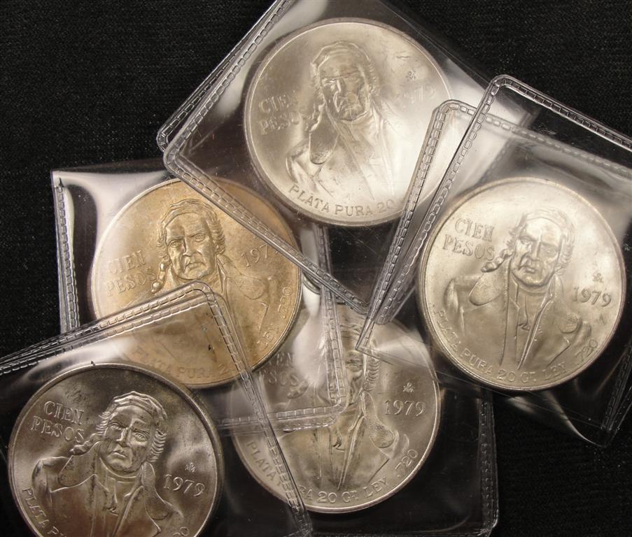 For sale 5 AU Mexican Silver 100 Pesos Coins all dated 1979 Some with toning For $130 Shipped. Paypal gift or money order only at this price. Each coin is 72% silver and the 5 together contain 3.214 troy ounces Spot as of 9/2 is roughly $138