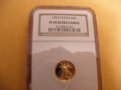 $5 US 1993 AMERICAN EAGLE GOLD COIN, 1/10 OZ. PURE GOLD.....NGC / PF 69 ULTRA CAMEO This was part of my fathers collection before he passed, I'm not to much of a coin collector and could use the money right now. First person with $400 Takes it, Payment will be made through paypal only...Shipping will be usps priority mail. Interested send me a message, Thanks