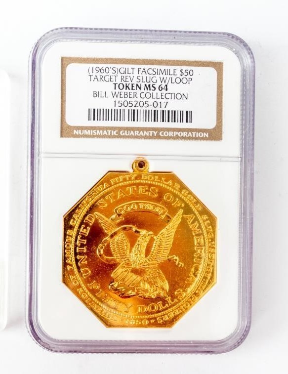 Saw this at an auction and thought it was an interesting piece. I know Bill Weber was really into $50 slugs and was even putting together a comprehensive catalog before he died. These were sold by Holabird Americana in a Bill Weber Memorial auction. Holabird had them slabbed because Bill detested slabs! Thoughts on value? Thanks in advance!
