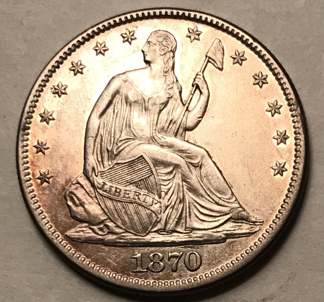 She’s an 1870, Variety 4-Motto Above Eagle. This design was used from 1866 through 1873. The mintage for this coin is 633,900.