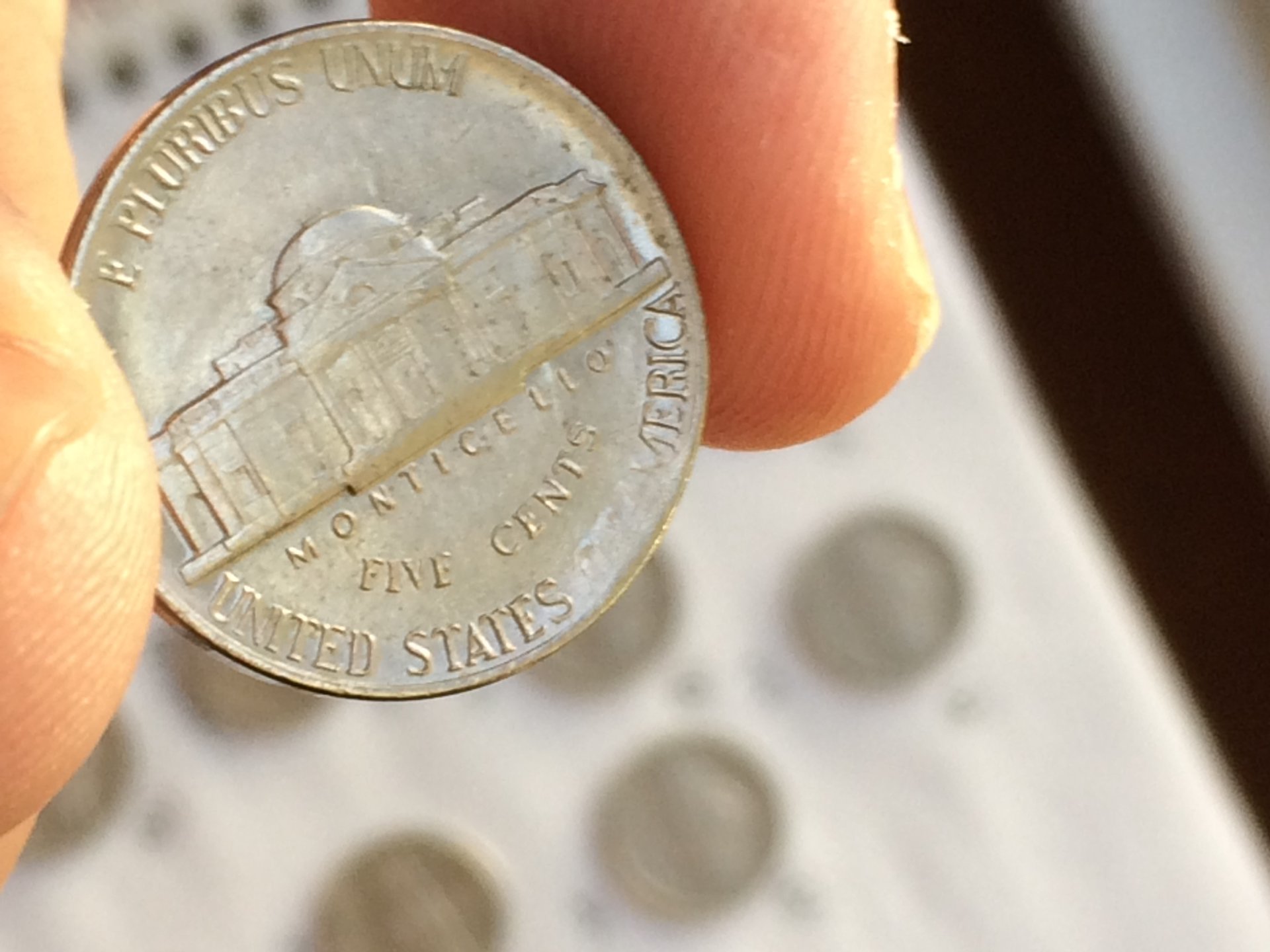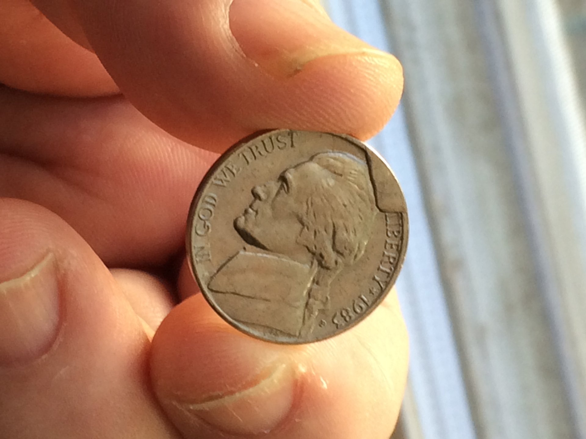 Awesome CUD, and could very well be, a slightly later strike of, CU-5c-1983P-05. Compare here: http://cuds-on-coins.com/jefferson-nickel-cuds-1983/