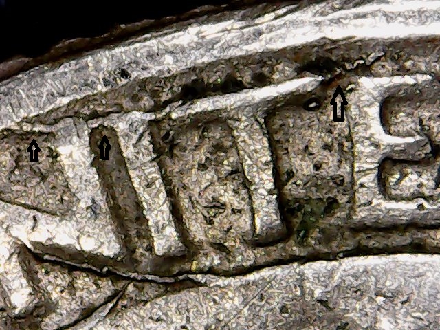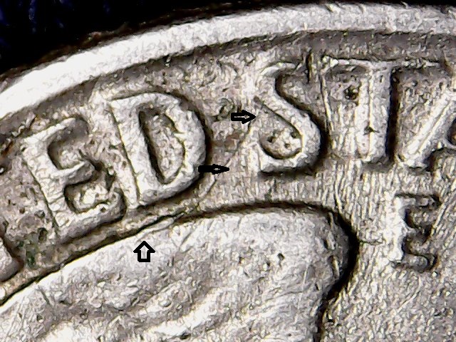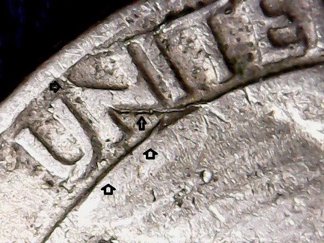 From what I can see on the larger one. The left side definitely goes to the rim, only you can tell if the right side actually goes up and touches the rim. My quarter you cannot photograph the crack, I should say small separation or small fracture. But under magnification you can see the fracture. Have you seen if Mr. Neff's interesting in this one.? What's an email. It's free.:rolleyes::blackalien: