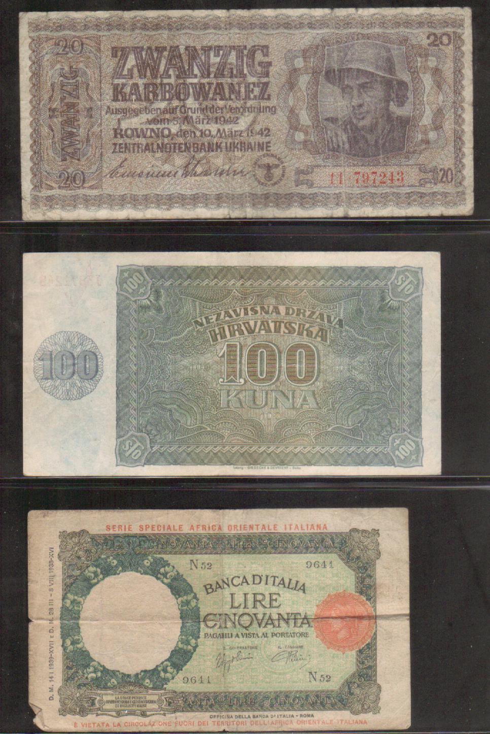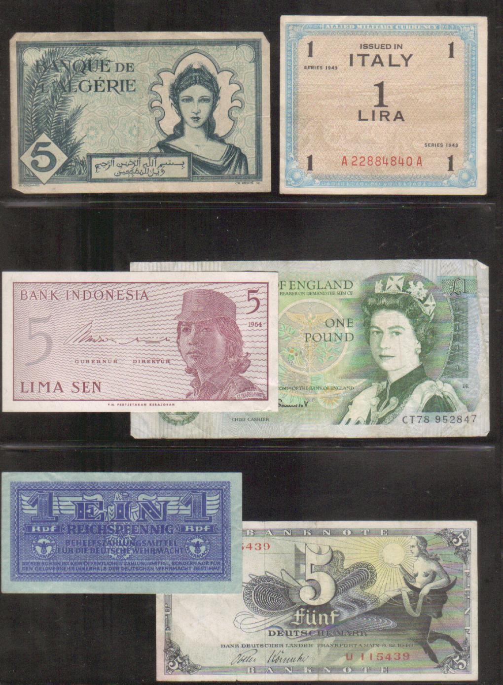 Interesting and diverse group; conditions as shown. Plastic pages not included. Page of 3: Ukraine, Croatia, Italian East Africa (Pick #1). Page of 6: Algeria, Italy, Indonesia, Great Britain, Nazi Germany, Federal Republic of Germany (Bank Deutscher Lander). Price, $20 postpaid. Shipped only to the United States. PayPal or money order, no cash please.
