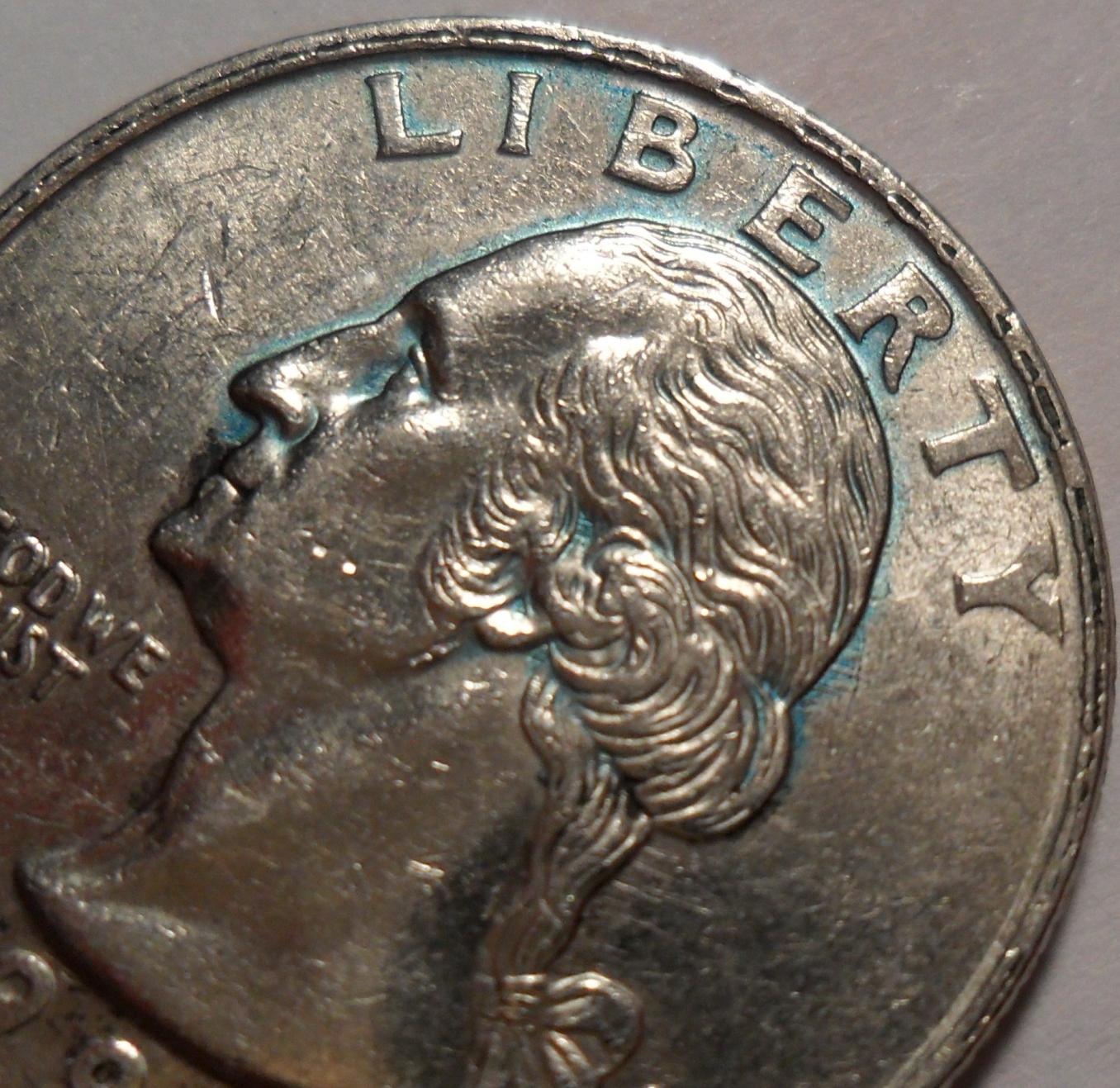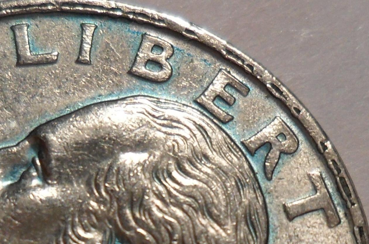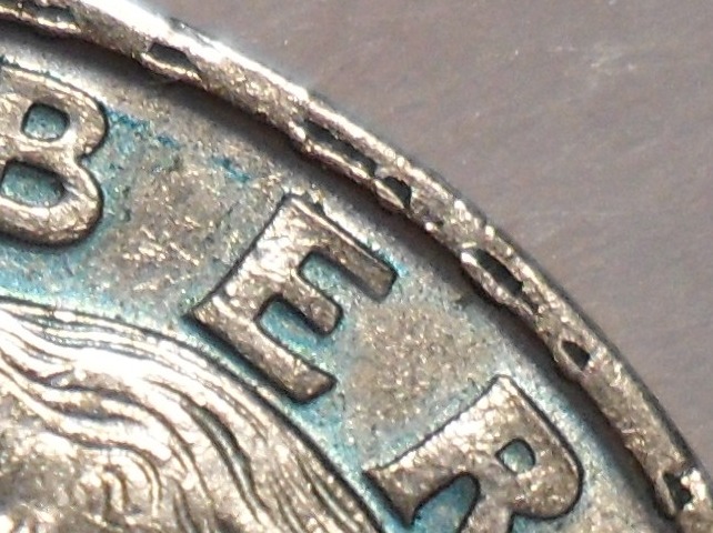 I'd say with all that blueish coloring on it, perhaps something blue got on the coin and someone cleaned it, wrongly, perhaps acid dip that cause the rim to look the way it does now.