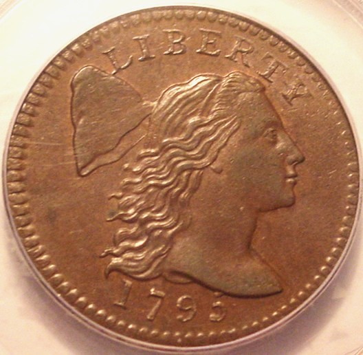 This is an example of the Plain Edge 1795 cent. Earlier these coins were struck on heavier, thicker plancets which allowed for edge lettering. In an effort to improve the first mint's financial situation, Congress passed a bill that allowed George Washington to lower the weights for the half cent and large cent by executive order. He did that in late 1795 which explains why variety 76 comes in two subvarieties, the thick planchet (a) and the thin planchet (b).