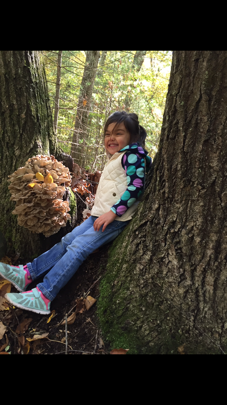 My daughter with our best find of the year, a solid c. 12lbs hen of the woods :)