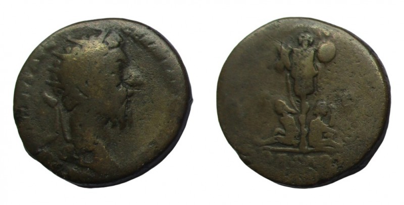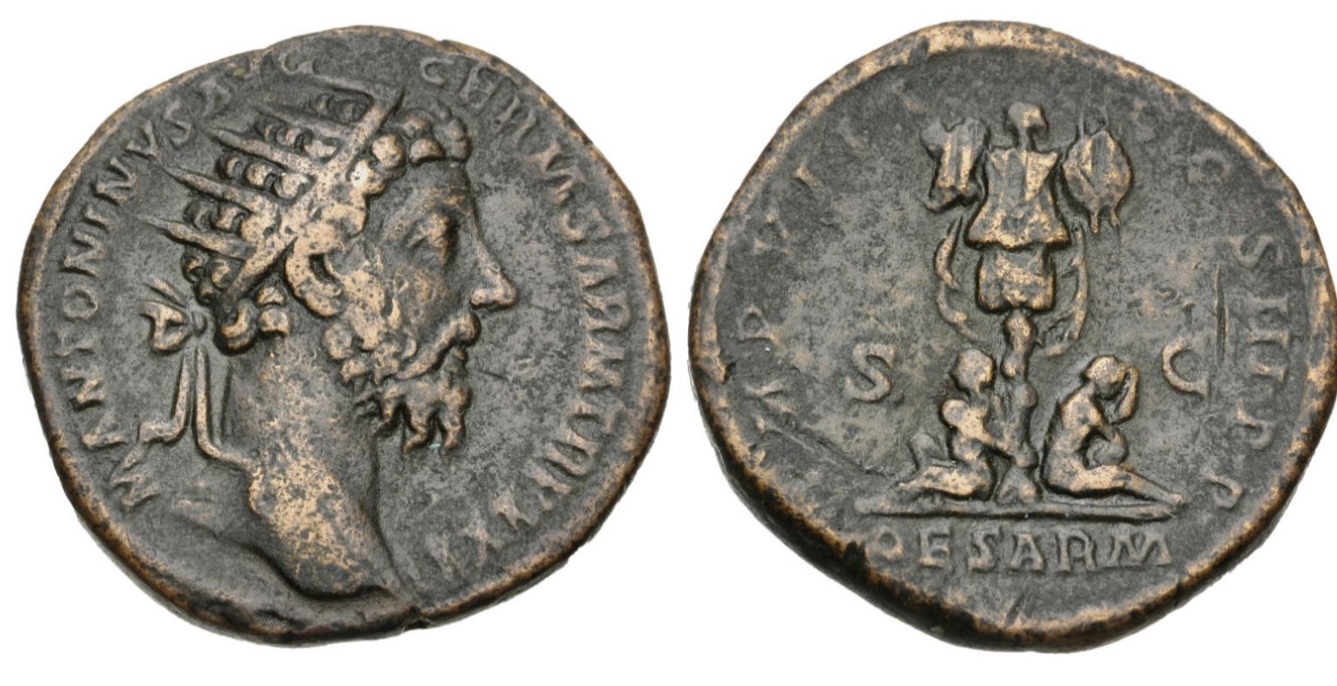 Marcus Aurelius, Roman Empire, sestertius, 171–172 AD, Rome mint. Obv: M ANTONINVS AVG TR [P XXVI], bust of Marcus Aurelius, draped and laureate, r. Rev: [IMP VI] COS III, Roma seated l. on pile of armor, leaning on shield, holding sceptre; in fields flanking, SC. 30mm, 26.95g. Ref: RIC III Marcus Aurelius 1037. (Struck on occasion of the Roman victory in the Marcomannic Wars in 171/172 AD, after which Marcus Aurelius assumed the title Germanicus. Likely, Roma sits on the weapons captured from the Germanic tribes.)
