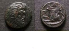 Cimmerian Bosporus, Pantikapaion Æ20 / Griffin Date: 4th Century BC Measure: 20.06 mm Weight: 6.85 grams Obverse: Head of Pan right Reverse: Π-A-N, Forepart of griffin left, sturgeon below Attribution: MacDonald 69 ARKADIA, Arkadian League. AR Obol Megalopolis mint Circa 340-330 BC Diameter: 10 mm Weight: 0.74 grams Obverse: Horned head of Pan left Reverse: League monogram above syrinx Reference: BCD Peloponnesos (Megalopolis) 1517-8; HGC 5, 930 ... it's all I got ...