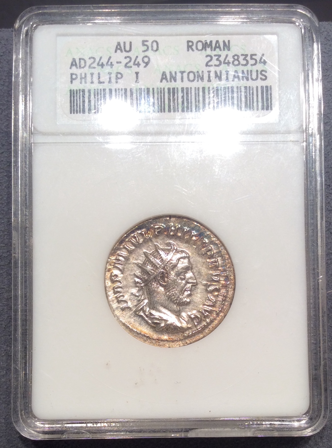 This antoninianus of Philip I arrived today. It happened to be in a slab, which caused peripheral toning on both the obverse and reverse. I really like the look of this coin, which is nicely struck with full luster. The reverse portrays Roma seated holding Victory and a spear. The inscription, which is fairly hard to read, says ROMAE AETERNAE. Attribution is RIC 106. It is in an old ANACS soapbar slab. Here’s the game: Guess what grade they gave. @Conder101 I have not seen an ancient coin in a soapbar ANACS holder. Before I crack it out, is there any value in the holder itself? I really want to crack it out to get decent pictures of how this coin truly looks. For those of you who have no sense of fun and don’t care at all, feel free to post anything relevant.