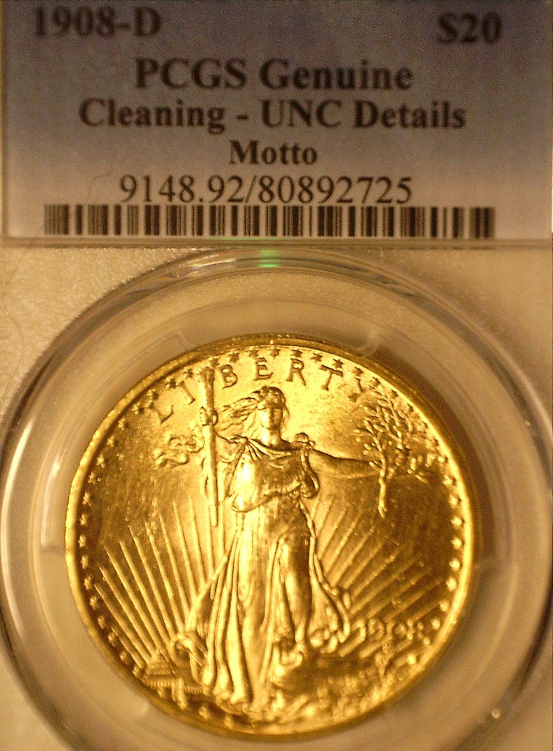 A golden opportunity on a scarce 1908D returned as "cleaned" UNC Details. I believe with current grading standards this coin should grade MS64-65, have priced at less than the lowest Unc. suggested value for this type/date coin. Will guarantee if a buyer carefully removes from the current slab and submits to NGC, it will return MS63/greater or I'll refund funds paid + my $45 current charge for large volume submission. Regardless, full refund paid if buyer is dissatisfied. Here's a "comp" PCGS MS64 with device gouges, rays damage, etc.: http://www.ebay.com/itm/1908-D-NO-M...691400?hash=item465198fcc8:g:pO4AAOSwdvpWDrTm Here's the believed relatively flawless coin without "hairlines", rub, wear, minimal bag marks, flawless undisturbed luster offered Double Eagle: