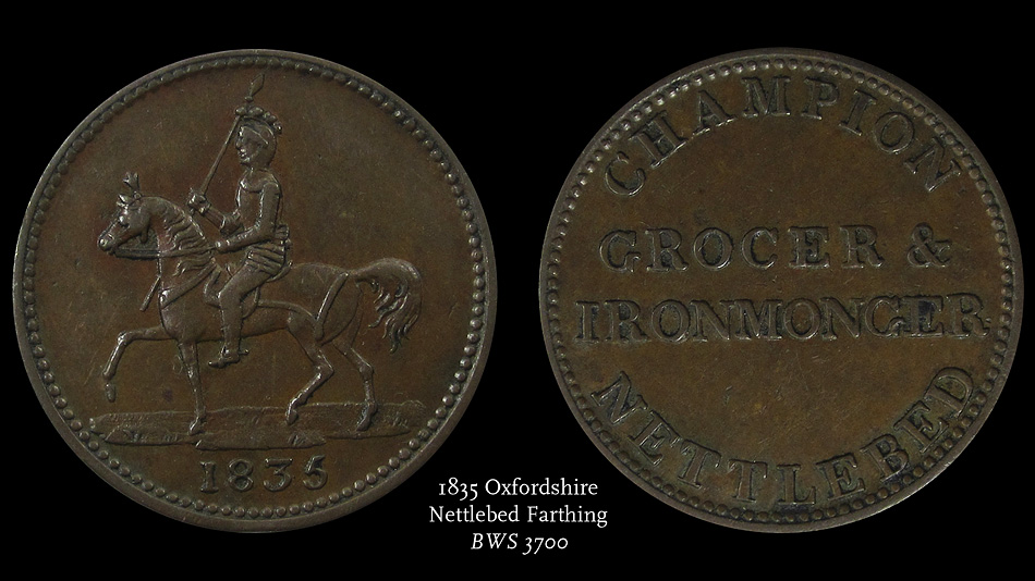 These are two of my newer quite old tokens. The first is a nice Conder token from Kent. The second is an "unofficial farthing" of Oxfordshire 1835.