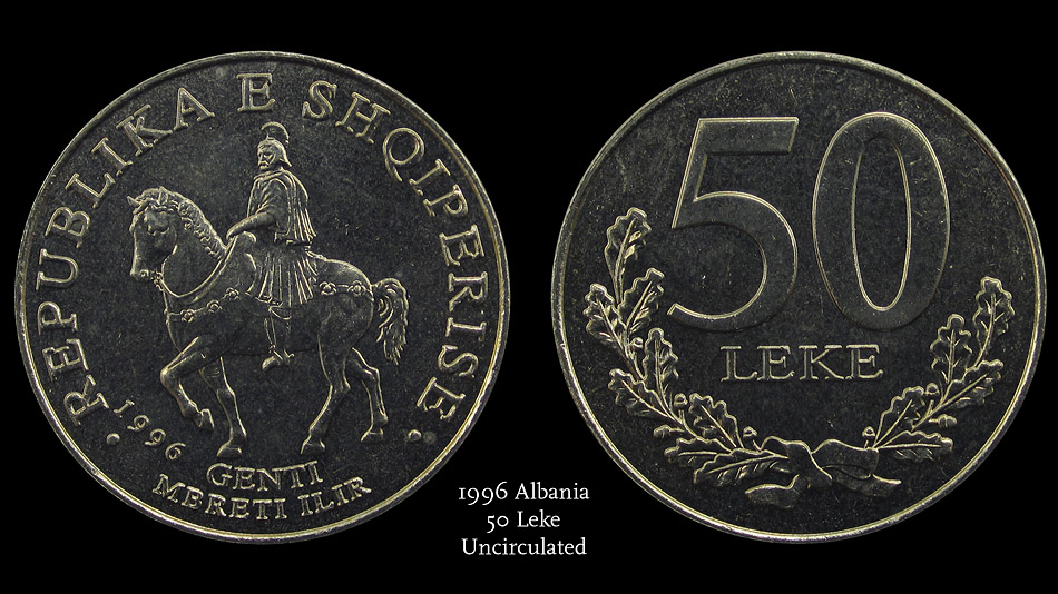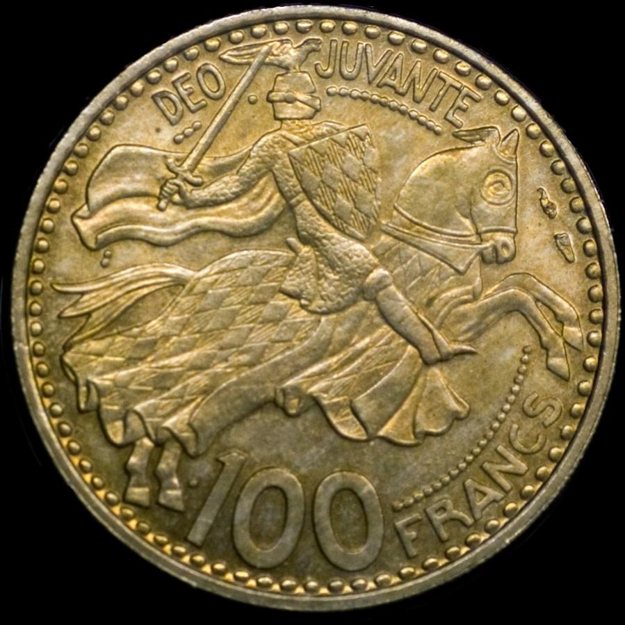 Here's a coin I picked up for one of my son's collections because he liked the Knight on his horse. 100 Francs from Monaco (1950):