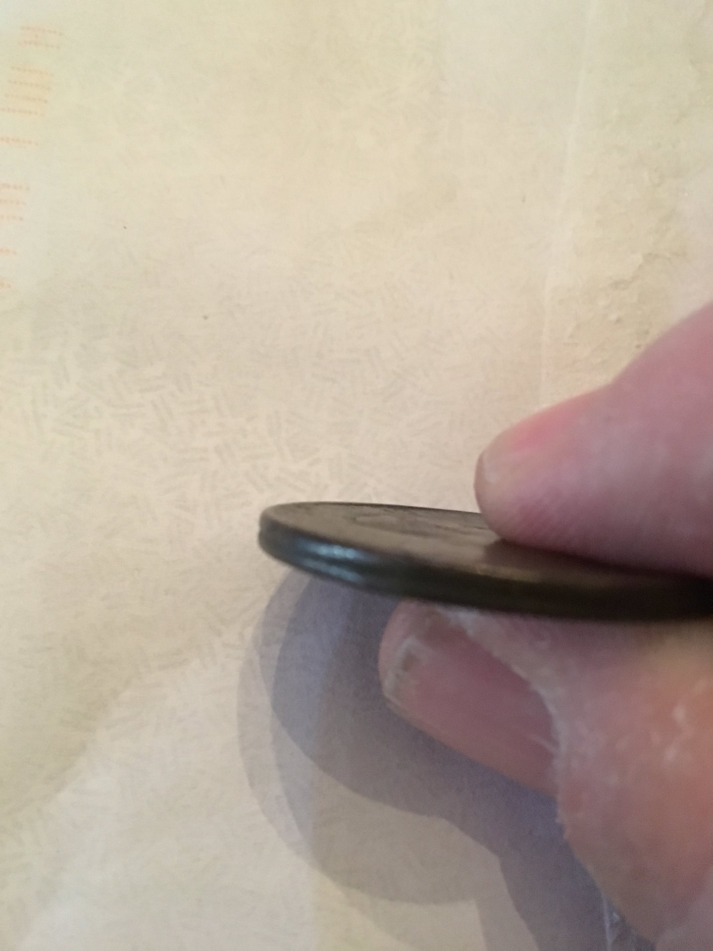 I don't have a ruler or a scale with me. It's about the same size as a US Large Cent, or slightly larger, it has a rim that makes it look like two of these were welded together. If these descriptions lack, I apologize and will measure it when I get home.