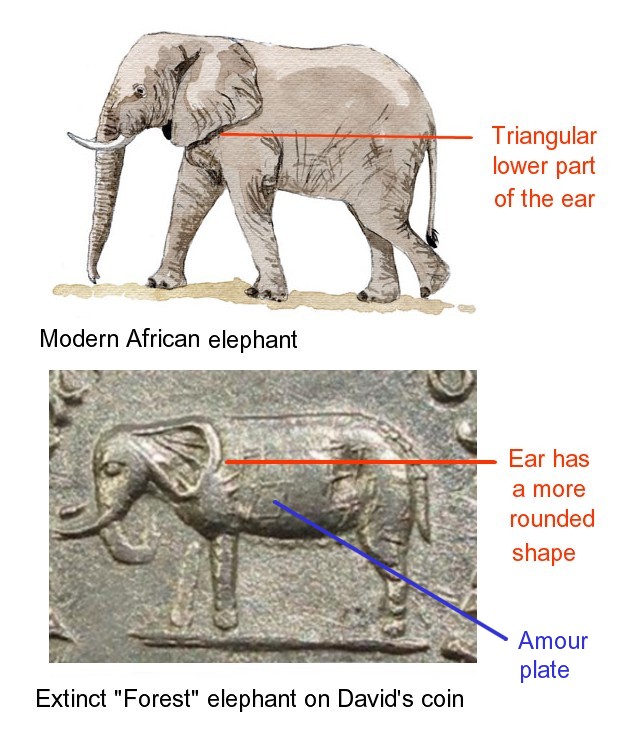 Incorrectly, I had assumed that the elephants on these coins were African elephants, which can be distinguished by having ears roughly in the shape of the African continent. I had never noticed that the elephants on these coins had differently shaped ears. Here's mine (yet again):