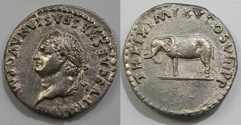 IMP TITVS CAES VESPASIAN AVG PM Laureate head of Titus right. Rev. TR P IX IMP XV COS VIII P P Elephant, wearing cuirass, advancing left.