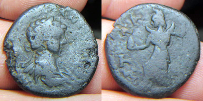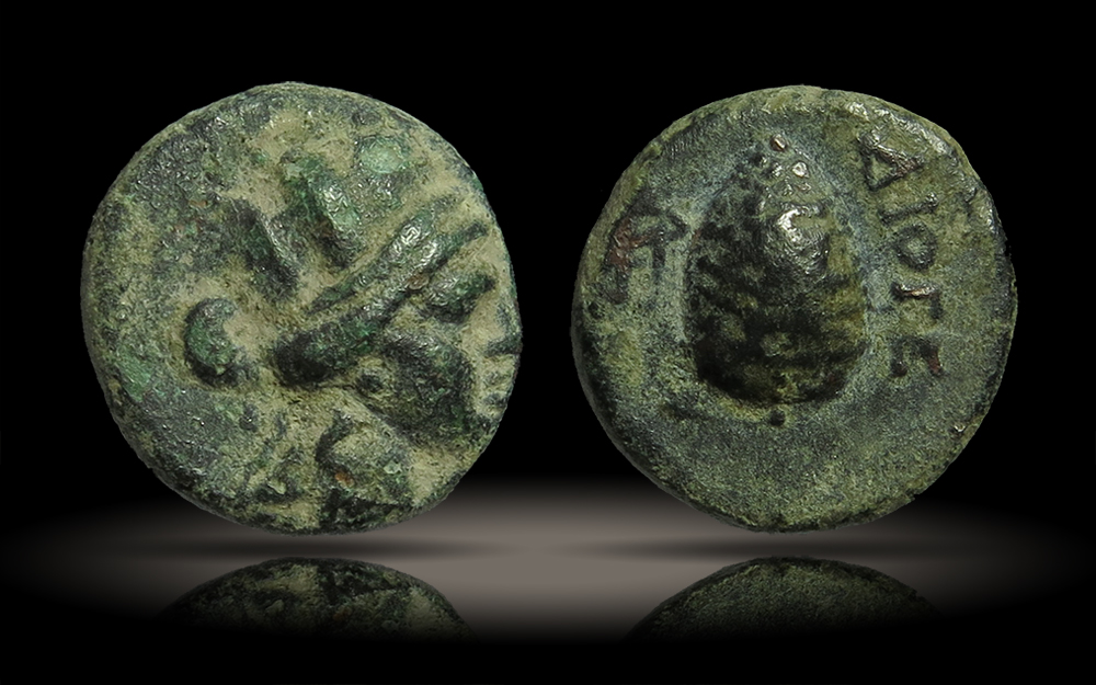 The thyrsus (θύρσος) of Dionysus was topped with a pine cone. Wikipedia describes the thyrsus as "a wand or staff of giant fennel (Ferula communis) covered with ivy vines and leaves, sometimes wound with taeniae and always topped with a pine cone": So this little knob at the top of Dionysus's thyrsus is a pine cone: Faustina Jr., 147-175 Roman provincial AE 9.06 gm; 24.7 mm Thrace, Anchialus, AD 147-175 Obv: ΦΑVCΤΕΙΝΑ ΝΕΑ CΕΒΑCΤΗ, bare-headed and draped bust, right. Rev: ΑΓΧΙΑΛΕΩΝ, Dionysos standing left, holding cantharus and thyrsus; panther at feet, left. Refs: AMNG 434; Varbanov 90; BMC --; SNG Copenhagen --