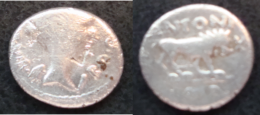 Nice coins everyone! Here's another quinarius: Fulvia, 41 BC Lugdunum mint AR quinarius 1.66gm - 13 mm Obv: No legend, windged head of Fulvia? As the goddess Victory right, III VIR R P C Rev: lion walking right, ANTONI IMP above/below lion, and with date numeral A - XLI (=year 41) flanking
