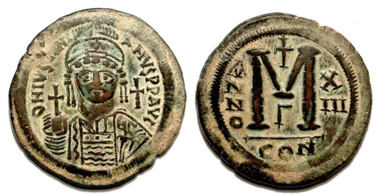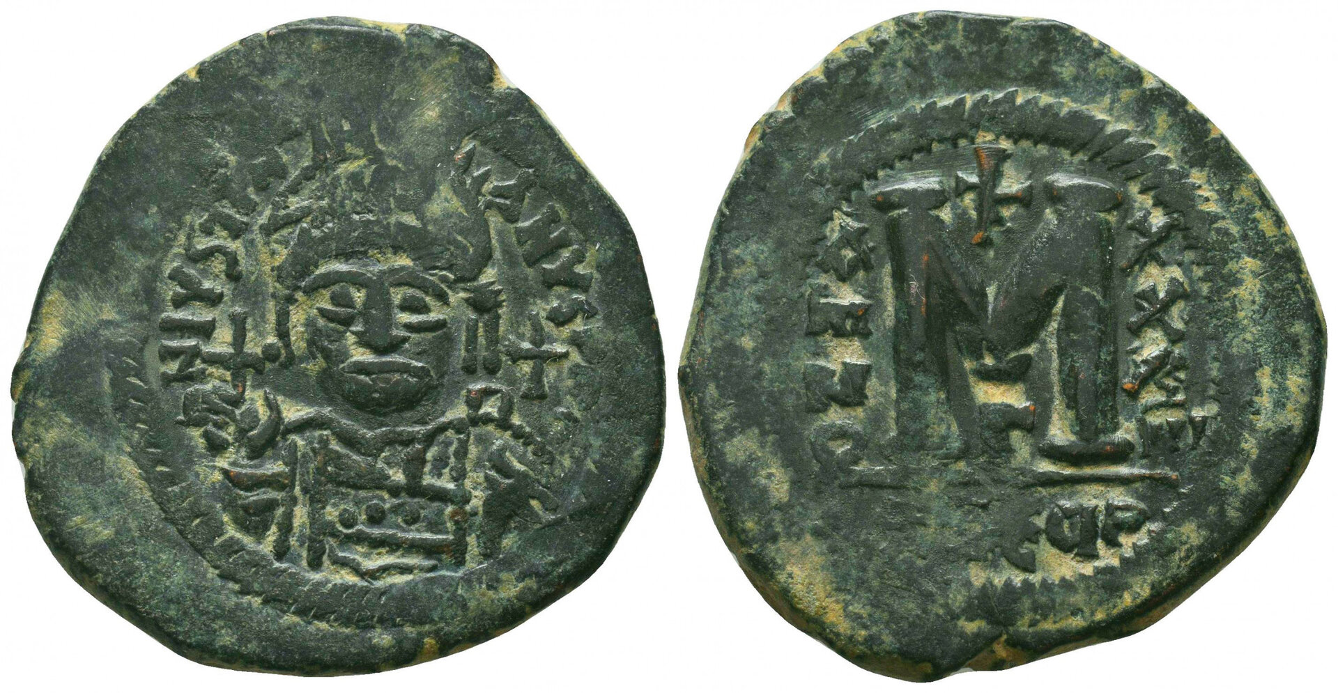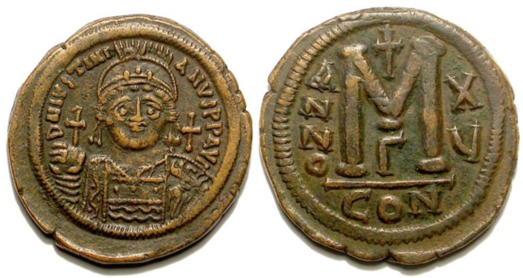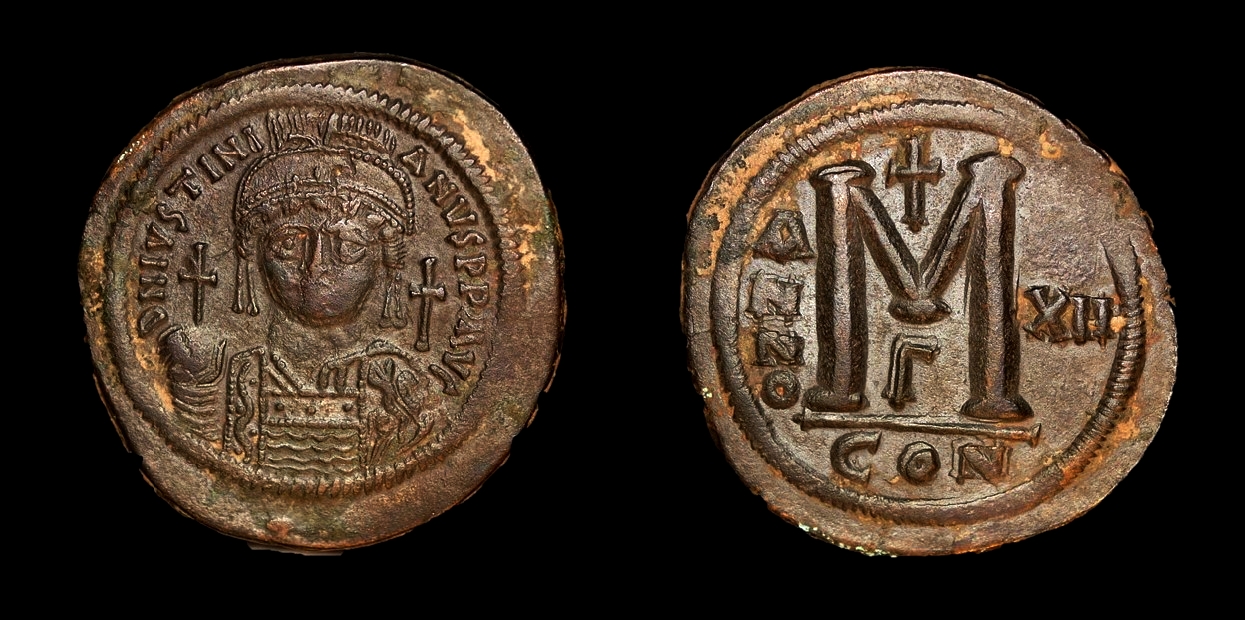 Justinian I, 527-565 AD. Byz_Justinian_AEFollis_SB163_Lanz0212.jpg Æ Follis (33mm, 20.01g, 6h). Constantinople mint, Fifth officina, dated Regnal Year 19 (AD 545/546). Obv: D N IVSTINIANVS P P AVG; Helmeted and cuirassed bust facing, holding globus cruciger and decorated shield; cross right in field. Rev: Large M between ANNO and X/YI/III; cross above; E below; CON in exergue. Ref: SB 163; Ratto 496; MIB 95a, DOC 44e. About Fine, some doubling on reverse.