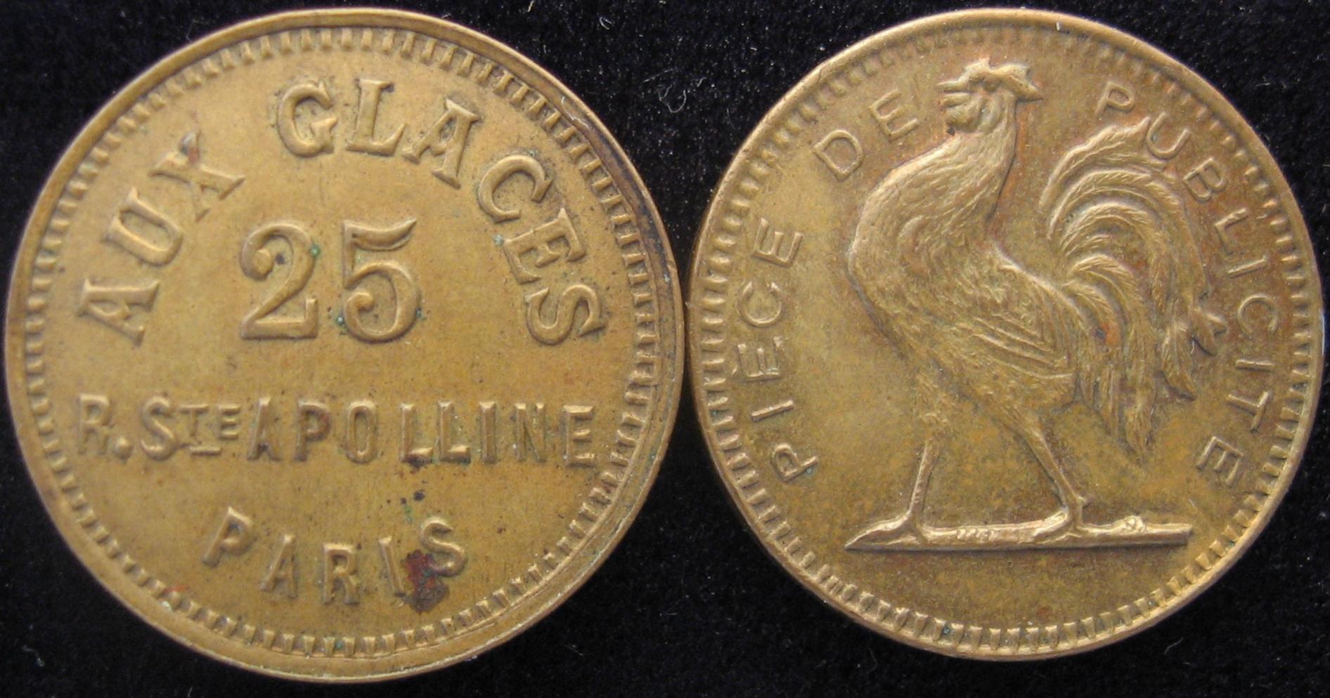 Yes I have several, they are made of embossed card and coated with brass, very light. If you were found in the vicinity of a brothel with large amounts of cash upon your person you went to jail for soliciting for prostitution, so the madames produced tokens for ice cream and other innocent stuff which were exchanged for cash. The token was then tendered to the prostitute for payment of services rendered.
