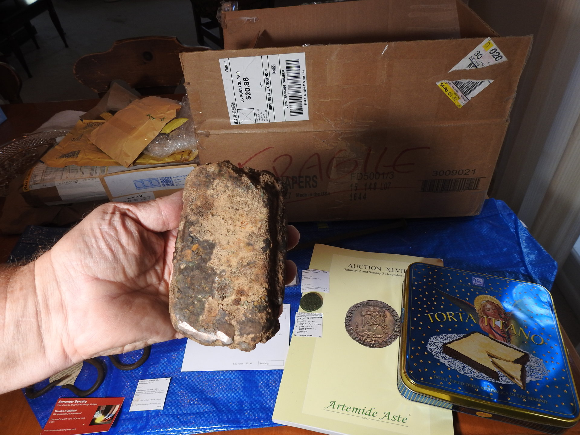I hit the jackpot today. This post is a bit like the one by @zumbly , but these came today! I will post most in separate threads. The Roman steelyard scale is not quite ancient, it is "old" by US standards. It has two weight scales 0 - 20 and 0 - 100 (pounds I assume). The scale is the one with 4 hooks and it can be hung two ways to give different lever arms => different weight ranges. It is interesting that minimum weight the scale can measure is about 6 pounds, or about the weight of the cast bronze bar. The scale came in the box labeled FRAGILE. They had to mean the box was in fragile condition with the steel weight poking on both ends. The scale is farmyard stout. The neatest item on the pile is a box of Christmas torts! Our dog was interested in the smells from Germany, Italy and Maine.