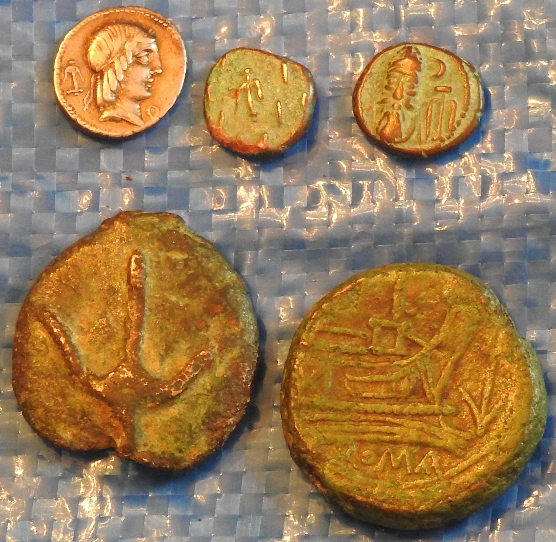 In the auction picture, I thought I could see a Ramo Secco line(s). In hand I see a line (or something). The "bottom" the bar has to much dirt, corrosion or mold scale to see features. The top was cleaned more, but also has scale that prevents a good look at the bar features. Dimensions are: Length: - 129 mm Width: 75 - 80 mm Thick: 57 mm at thick end and 37 mm at thin end weight: 2533 grams = 2.5 Kg = 5.6 US pounds = 7.5 Roman Pounds or Asses = 2.5 days of pay for a Roman soldier I will post more when I have a chance to take more pics.