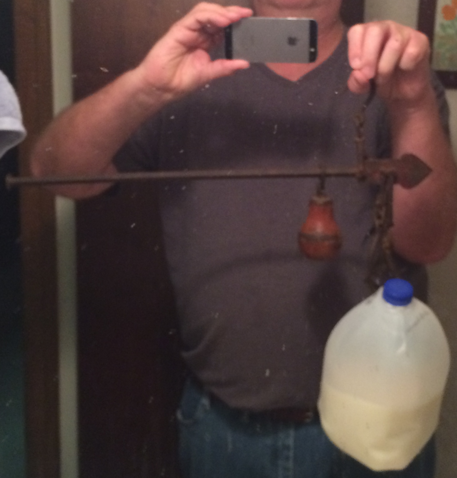 I will use this scale as part of my display nest month at the Money Show of the SW: "How Were Roman soldiers paid in 400 BC?" Rome did not issue coins until 300 BC or so. They started paying soldiers about 400 BC with the siege of Veii. Payment was by bronze. The bar shown above and aes rude were how payments were made. They had to use some kind of scale and weight standard. Heavy items were normally weighed with steel yard scales. This is a "modern" scale. It was in use early in the last century and maybe before. This is a Roman scale. It is on order, but not here yet. It is not complete, but has two of the main parts. The scale is in its high weight mode. See how close the scale weight is to the hook. One and a half gallons of water are below the scale range. I flipped the scale over for this pic. The scale has one hook close to the weighing hook for high range and one farther from the hanging hook for low range. This is the low range for the scale. The two jugs weighed 14 pounds, 0 ounces. A Roman soldier was paid 15 (US) pounds of bronze per week. That is 3 asses per day at 324.7 grams per as times 7 days per week = 6,800 g = 15 lbs. I need a strong holder for a week's pay. That will allow me to use the scale in range. I an not sure I have that many bronze pieces. By 210 BC, a week's pay at 21 asses was only 2 denarii.