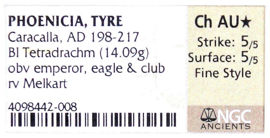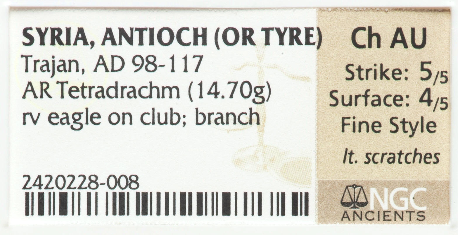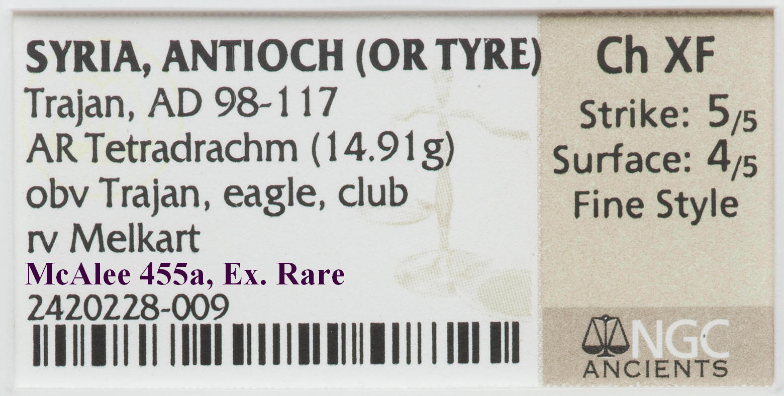 Blake, despite the attribution of Tyre on your slab, I believe the coin was minted in Antioch. There is a great deal of ambiguity between the experts (McAlee, Prieur, Butcher, Metcalf, Bellinger & Sydenham) as to where these tetradrachms were minted. McAlee offers sound evidence (die linkage) that some of these Tets could have been made at the Rome mint, or dies were made in Rome & sent to Antioch. Take note of the slab info that came with the Tet I posted with the graffito. When I had this coin slabbed, NGC was unwilling to make a commitment as to origin too , but there is no doubt in my mind that it was struck in Antioch. Your coin & the others posted that are similar I believe were also struck in Antioch. The coin pictured below I sold a long time ago, & NGC didn't commit to an origin on this coin too, although I'm sure it was struck in Tyre . This design type was copied from the Tyre mint for coinage of Caracalla too. Ironically when Prieur cataloged these coins he threw is hands up in the air , admitted his confusion, & listed all the types pictured in this thread under Tyre.