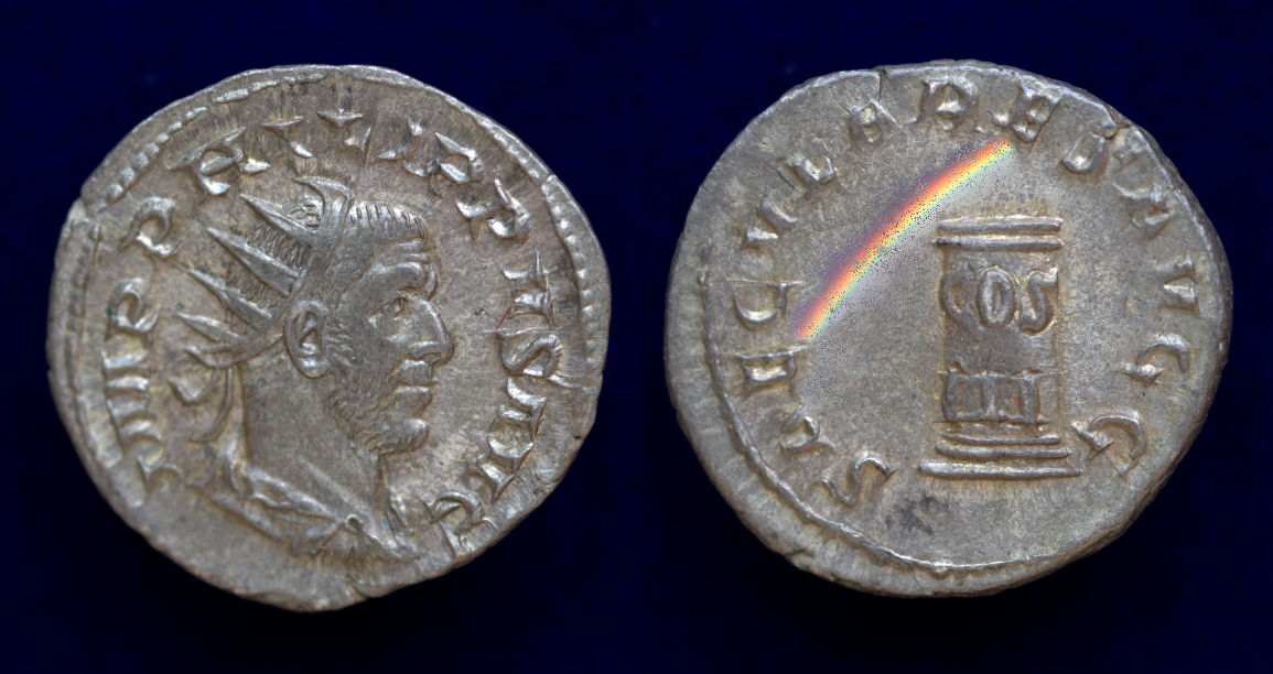 Out of boredom I ended up watching the weekly Heritage auction last night . Many high grade (slabbed) coins were fetching great prices, but one rainbow toned coin started a bidding war , see photo below. The coin sold for $1,080.00, including the buyers premium ! I don't ever remember a Philip I antoninianus selling for more than that . Rainbow toned coins are popular with modern issues, especially Morgan dollars. Now it appears the fever has spread to ancient coins .