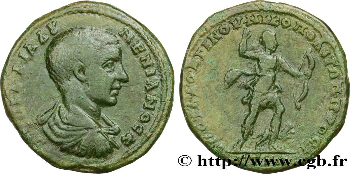 Rev.: ΥΠ CΤΑTIOY ΛΟΝΓΙΝΟΥ NIKOΠOΛITΩN ΠPOC ICTPΩ (Consular legate Statius Longinus, issued by the people of Nikopolis, at the river Ictro), Tyche enthroned to left, with mural crown, holding ears of corn and scepter.