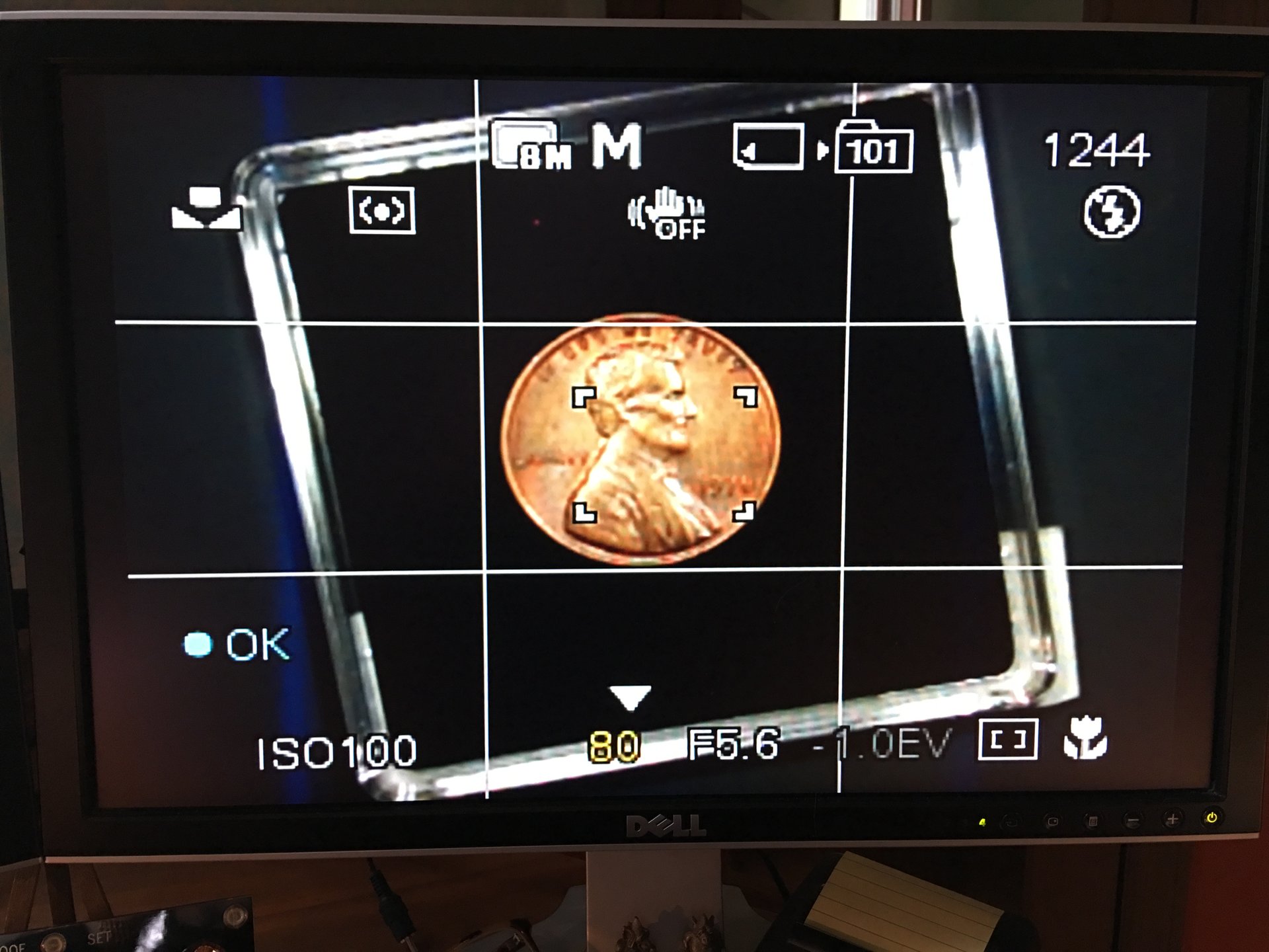 I can't fill the sensor with the image; I can't see the coin in focus; white balance is a guess; and I set exposure by eye by comparing the blurry screen image to the coin under the lights. Usually the camera reports this as -.7 or -.3eV.