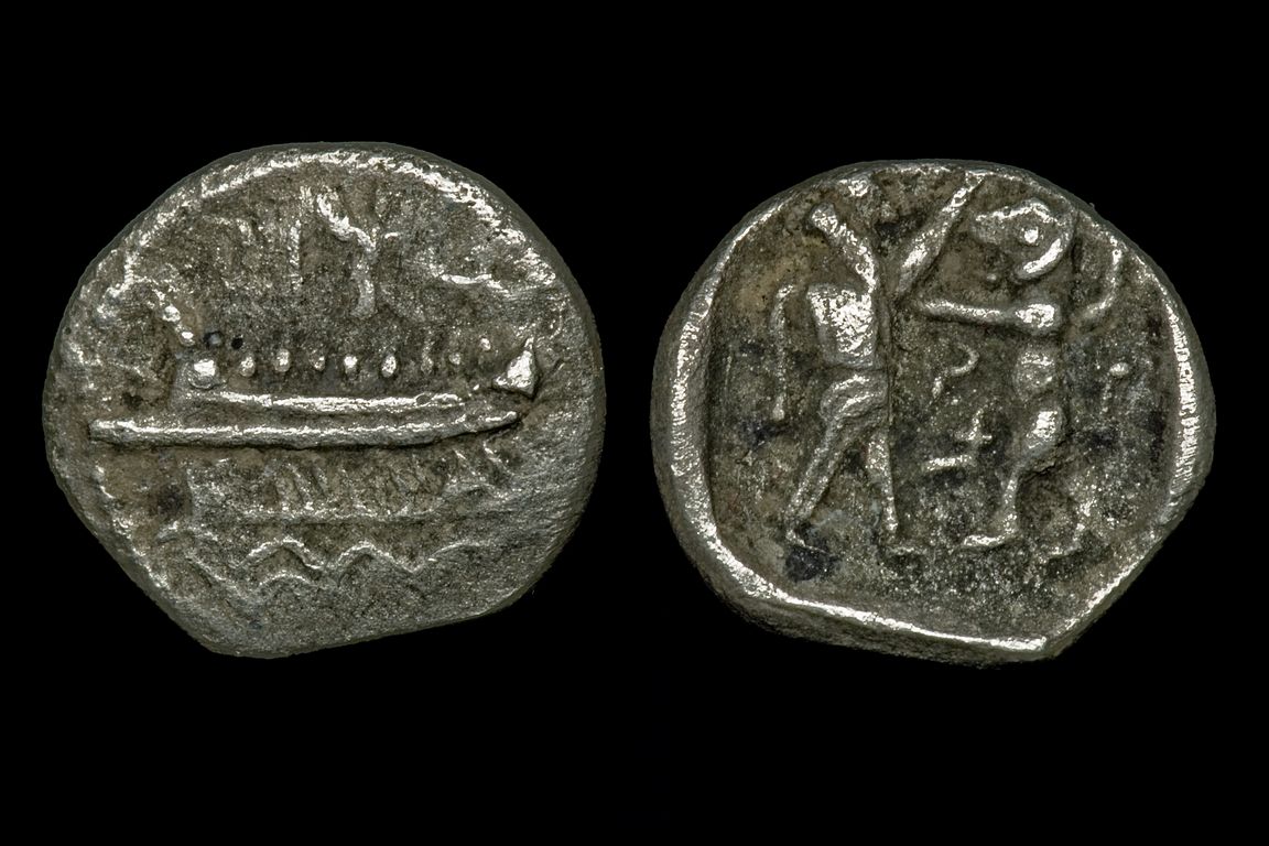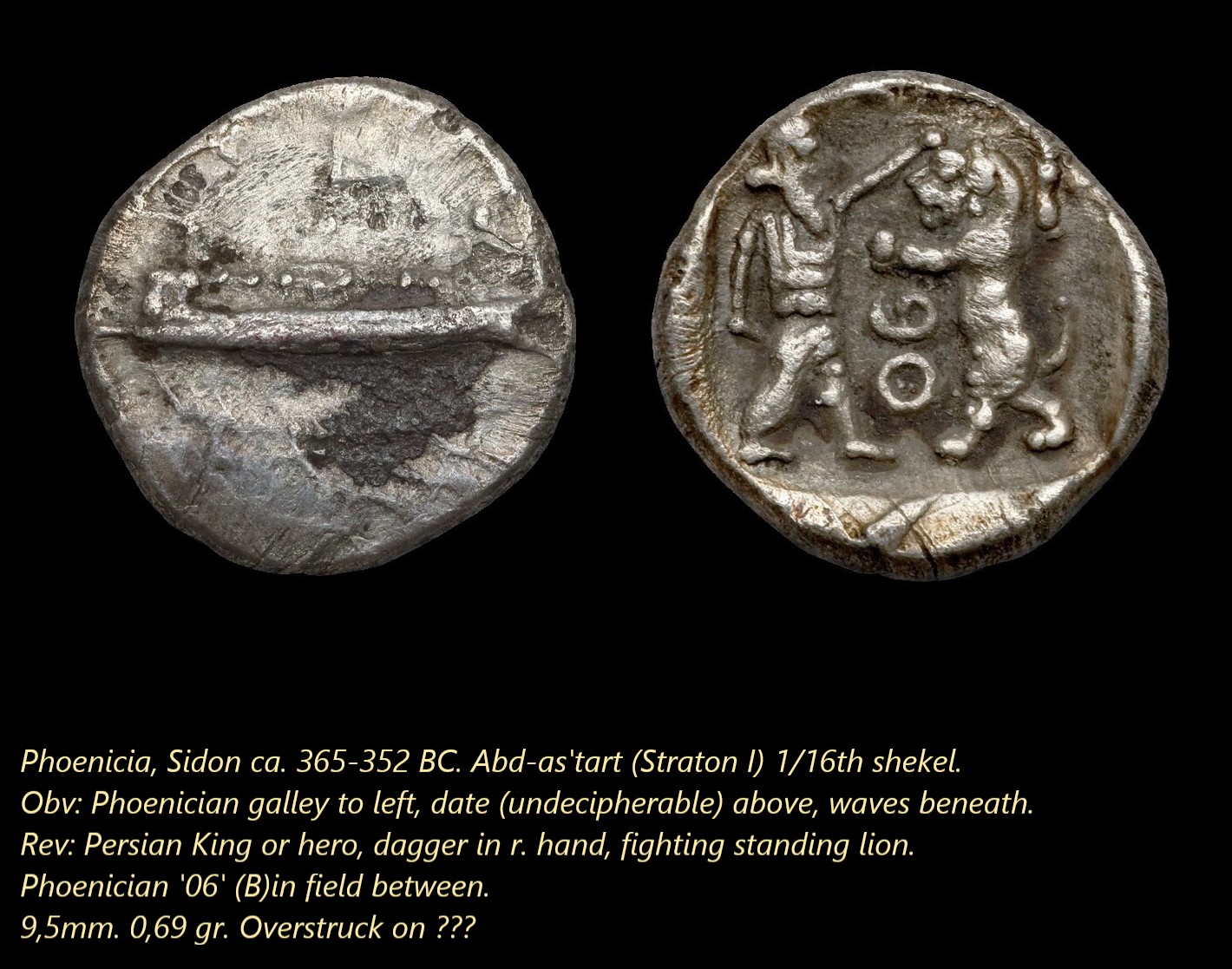 This series has confused me, as I've seen very similar coins attributed to either Sidon or Samaria. At the time I purchased these, I believed that the "O" signified Samaria (or a Samarian ruler) and the IIIIII on the Sidon coin indicated the year, and hence the rule of Straton I. I'm starting to believe that all of these issues are either Sidon or "roughly that area". While I believe the attribution of my "Sidon" coin, I'm now doubting my "Samaria" coin. In addition, the "stretching" on the coin makes me wonder if it's a fouree. Samaria 'Middle Levantine' Series. Circa 375-333 BCEAR Obol 9.7mm 0.65g Phoenician galley left ('b' in Phoenician) above, waves below. R: Persian king or hero, holding dagger in his right hand, standing right, grasping lion standing right, head to left, at mane; in field, O; all within incuse square. Meshorer & Qedar 199 Ex Ars Coin Wien Phoenicia, Sidon AR 1/16 Shekel`Abd`aštart (Straton) I dated RY 6 = 337/6 BCE 0.86g, 9mm, 12h. Phoenician galley to left; IIIIII above, waves below / Persian king or hero, holding dagger and standing to right, fighting lion standing to left; ['B] (in Phoenician) between; all within incuse square. E&E-S Group IV.5.4.c; DCA 866; HGC 10, 263 Ex Gorny & Mosch Giessener Münzhandlung 2012 Ex Roma 2021