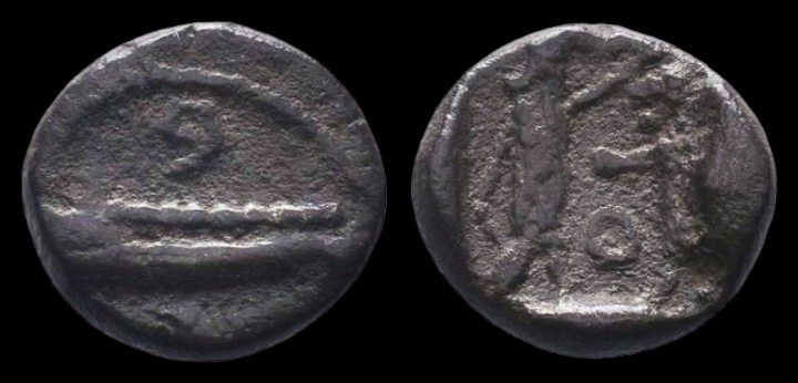 1/16 Shekel - Tyre Tyre 1/16 shekel 10mm 0.47g hippocamp l over waves - owl with crook flail Sear Greek 5916.BMC Tyre 43 5th-4th BCE