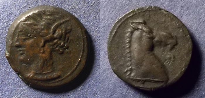 Attribution: Crawford 302/1; Flaminia 1; Sydenham 540 Date: 109-108 BC Obverse: Head of Roma right in winged helmet, ROMA behind, X below chin Reverse: Victory driving galloping biga right, holding reins and wreath; L.FLAMIN below horses Size: 18.74 mm Weight: 3.79 grams Zeugitania, Carthage 300-264 BC, AE19 4.26g Wreathed head of Tanit left wearing a pendant earring and necklace Horse head right SNG Cop 144 Sardinian mint